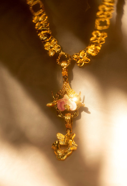 "Cherished Orchid" Necklace with Pendants - Pink Orchid House & Butterfly GOLD