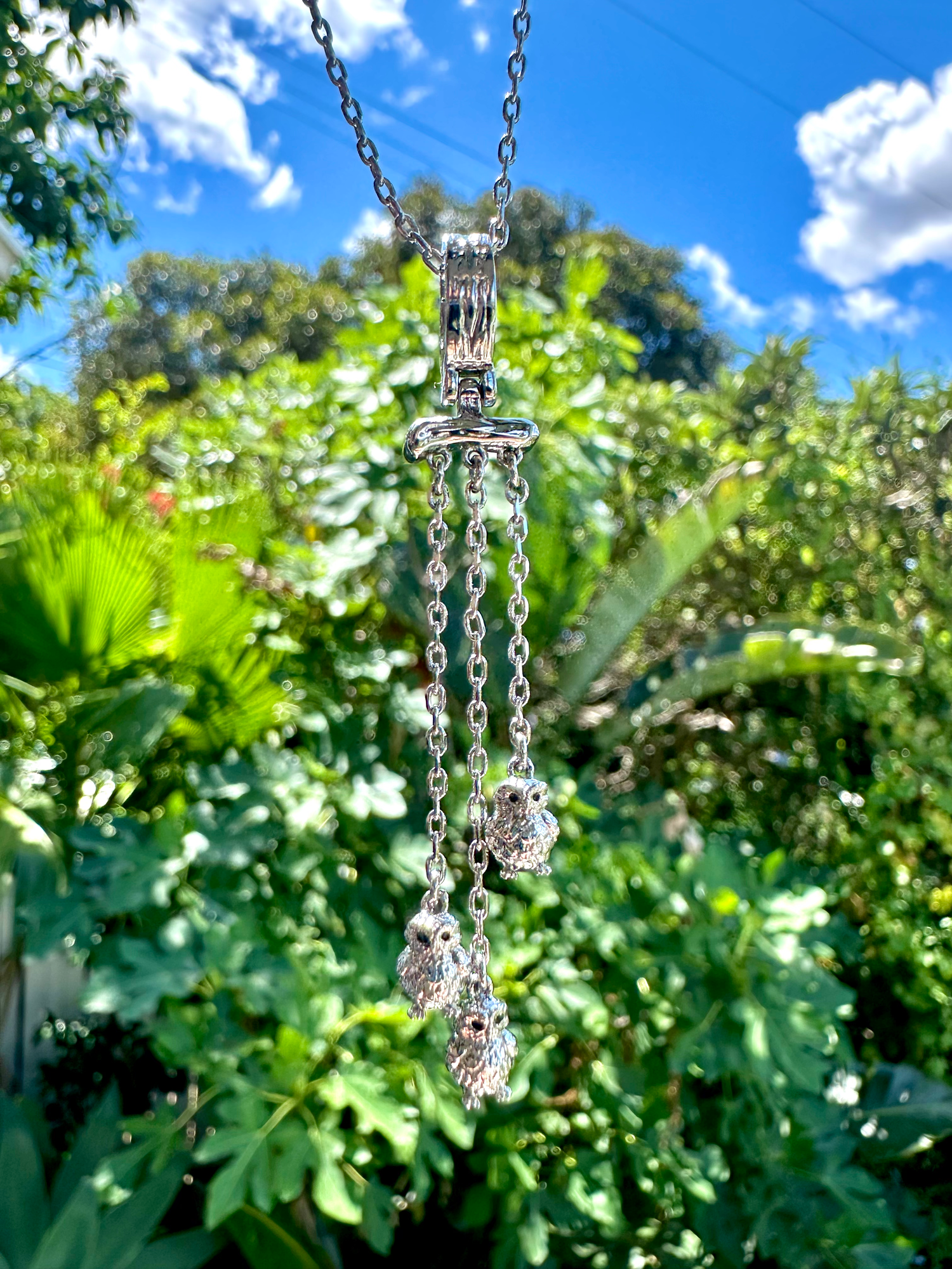 Pendant : 5.75cm long x 1cm wide | Each Baby Owl : 7mm tall | Chain : 15” with 3” extension (1" between ea.)