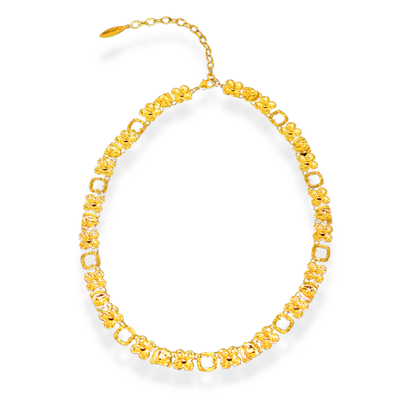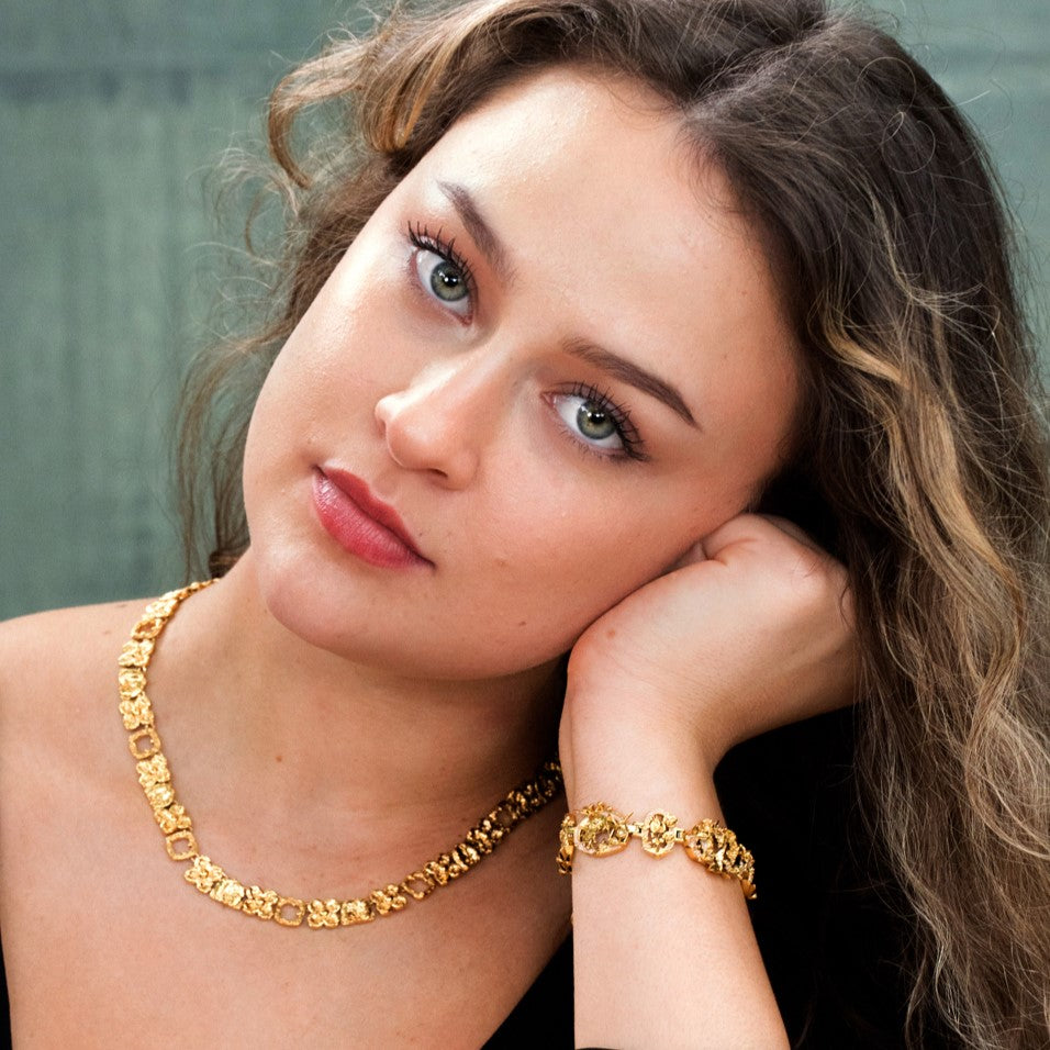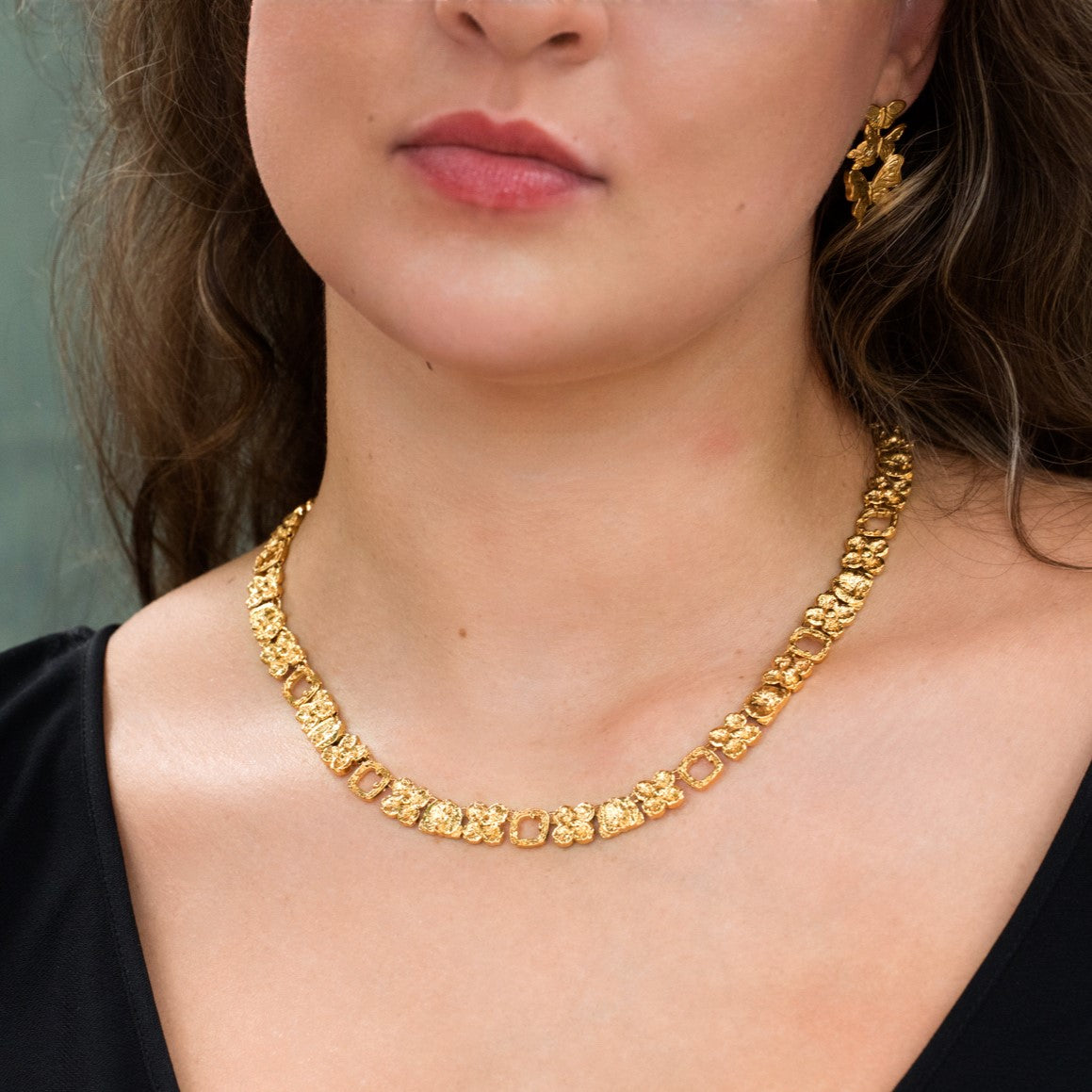 Inspired by Angela Mia’s bronze sculpture, A Flower Will Dance, this link necklace is crafted with 18K gold plate, with an exquisitely detailed motif of flowers.