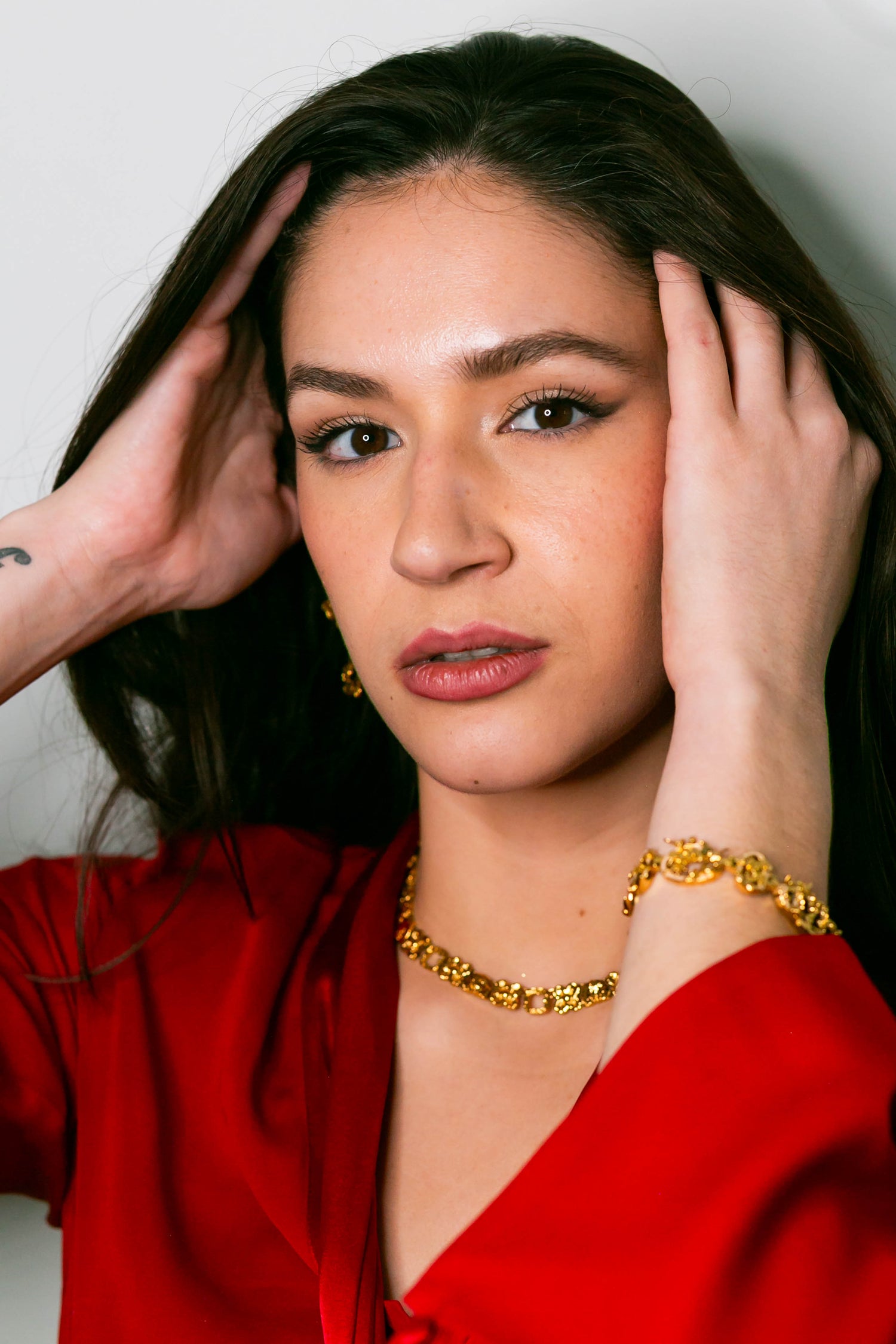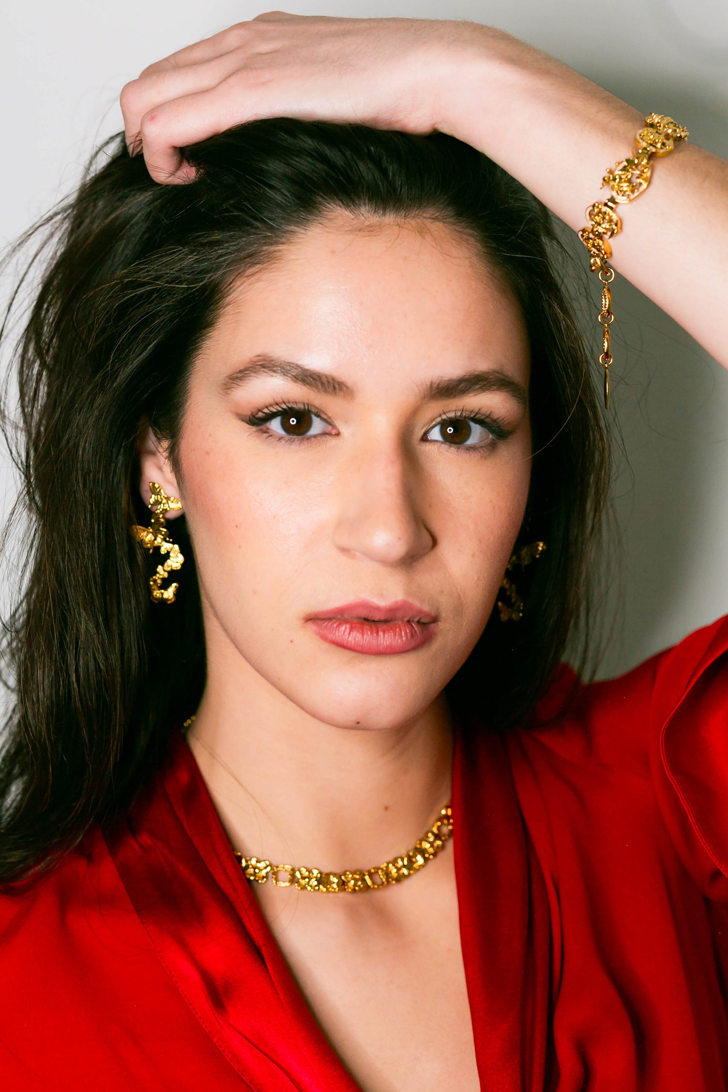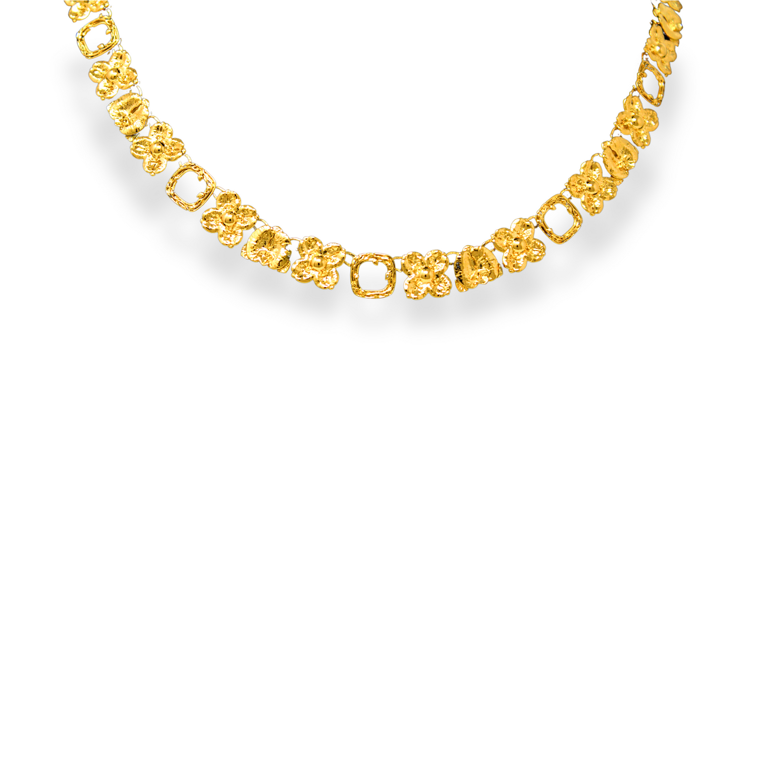 Inspired by Angela Mia’s bronze sculpture, A Flower Will Dance, this link necklace is crafted with 18K gold plate, with an exquisitely detailed motif of flowers.