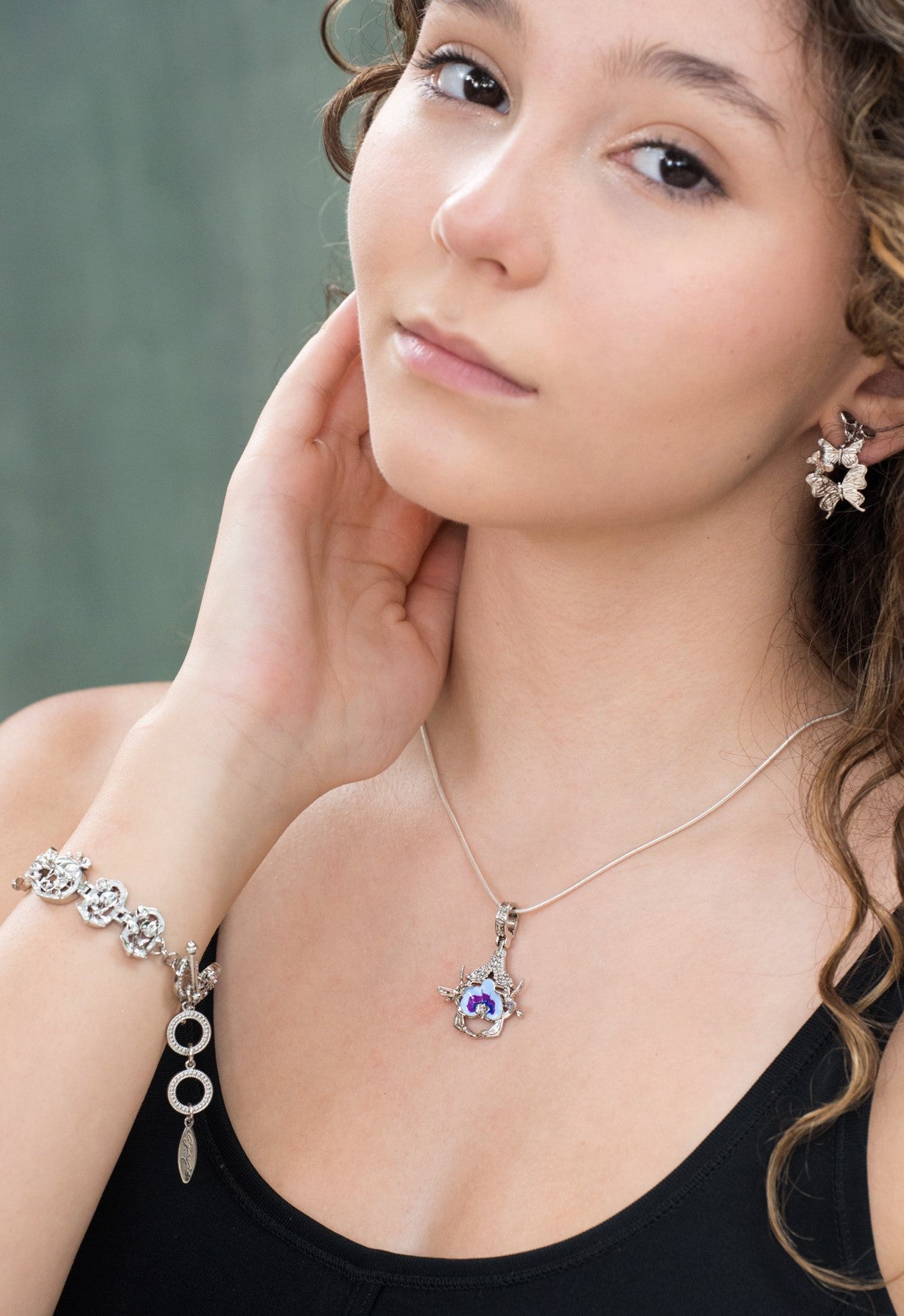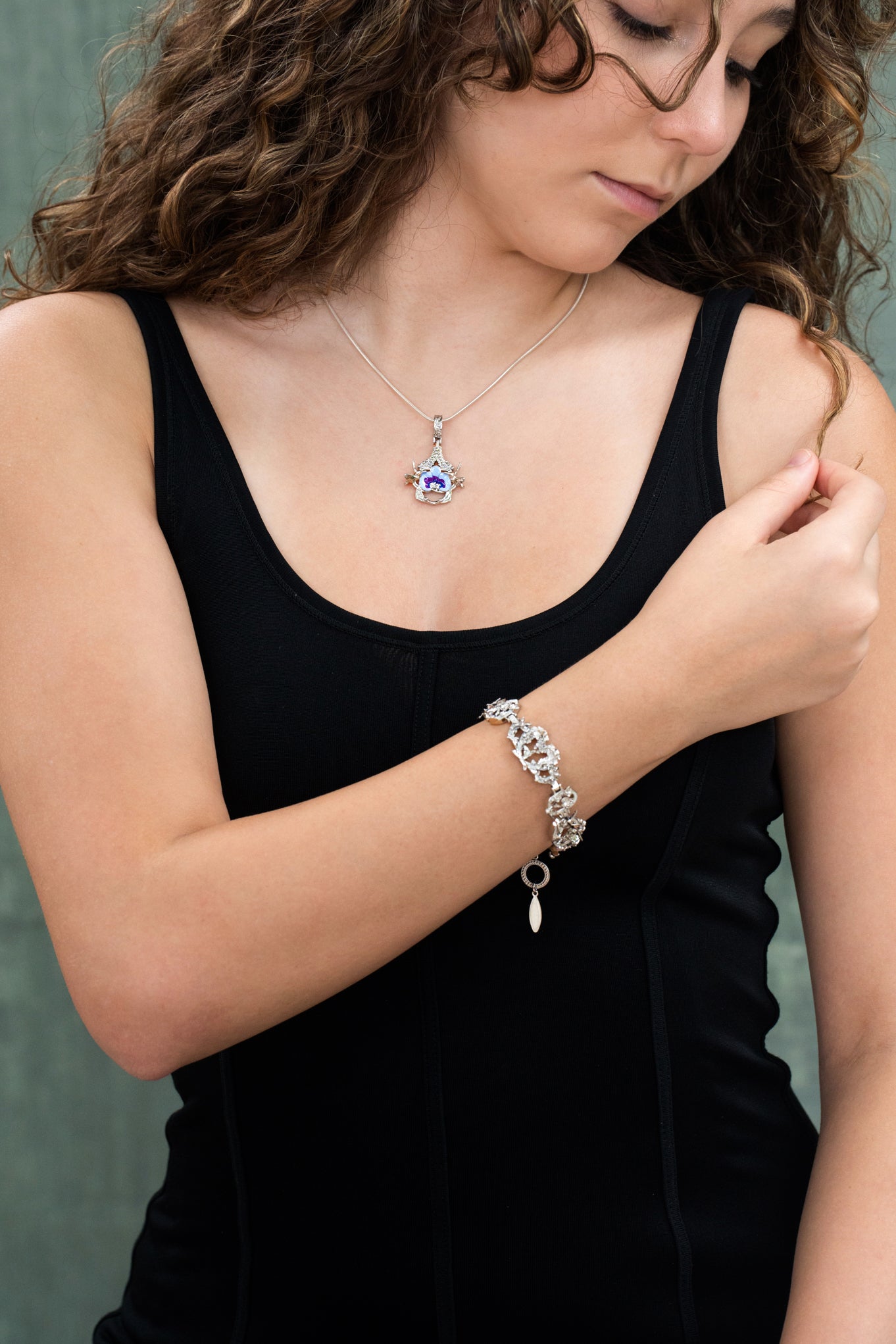 Inspired by Angela Mia’s bronze sculpture, A Flower Will Dance, this vibrant pendant is detachable and crafted with a white rhodium plate.