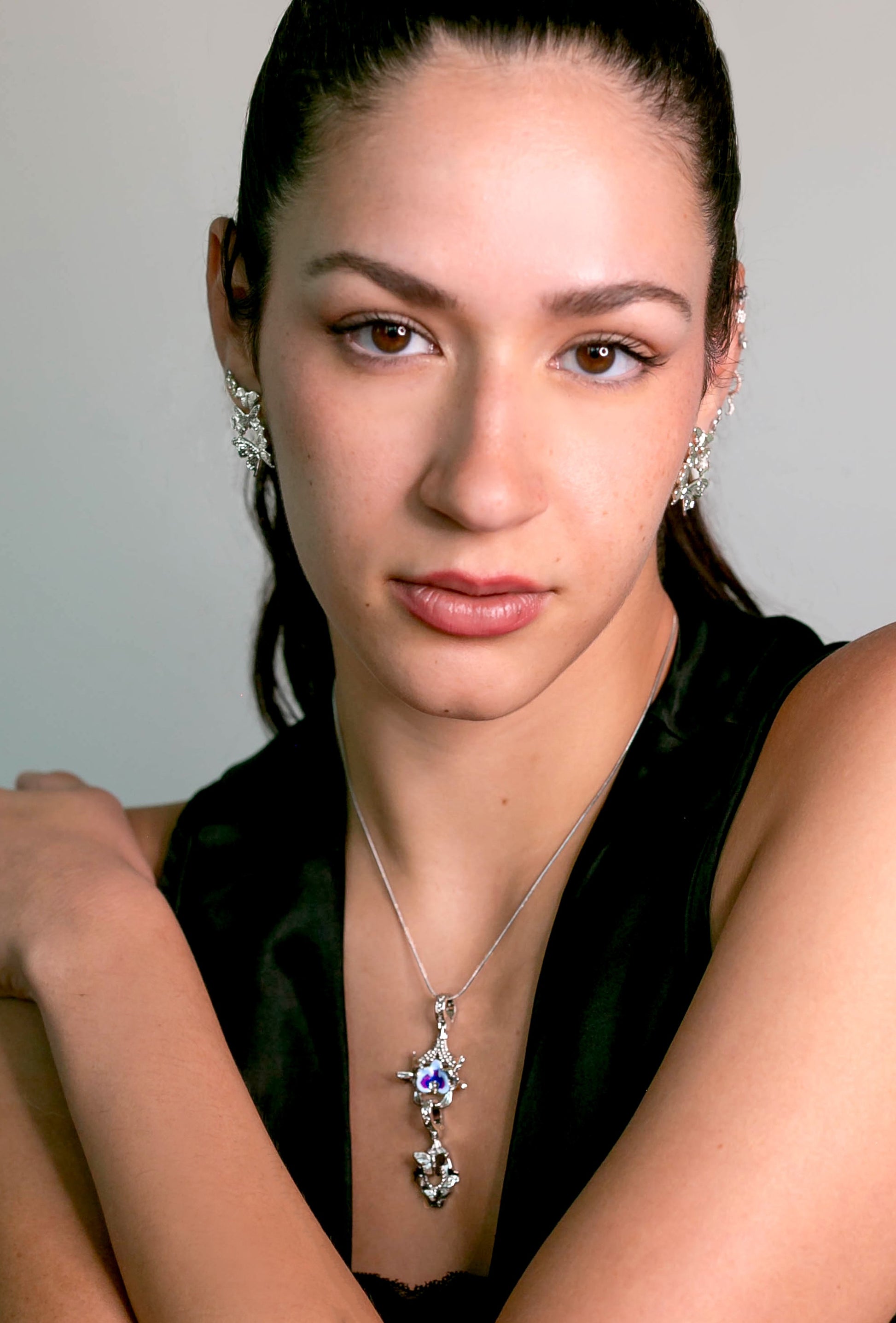 Inspired by Angela Mia’s bronze sculpture, A Flower Will Dance, each of these vibrant pendants is crafted with a white rhodium plate.