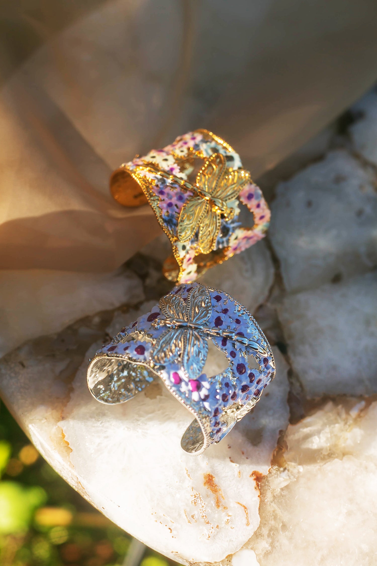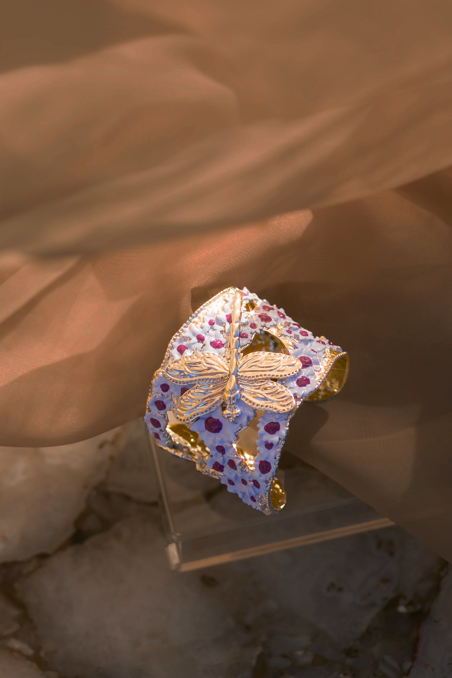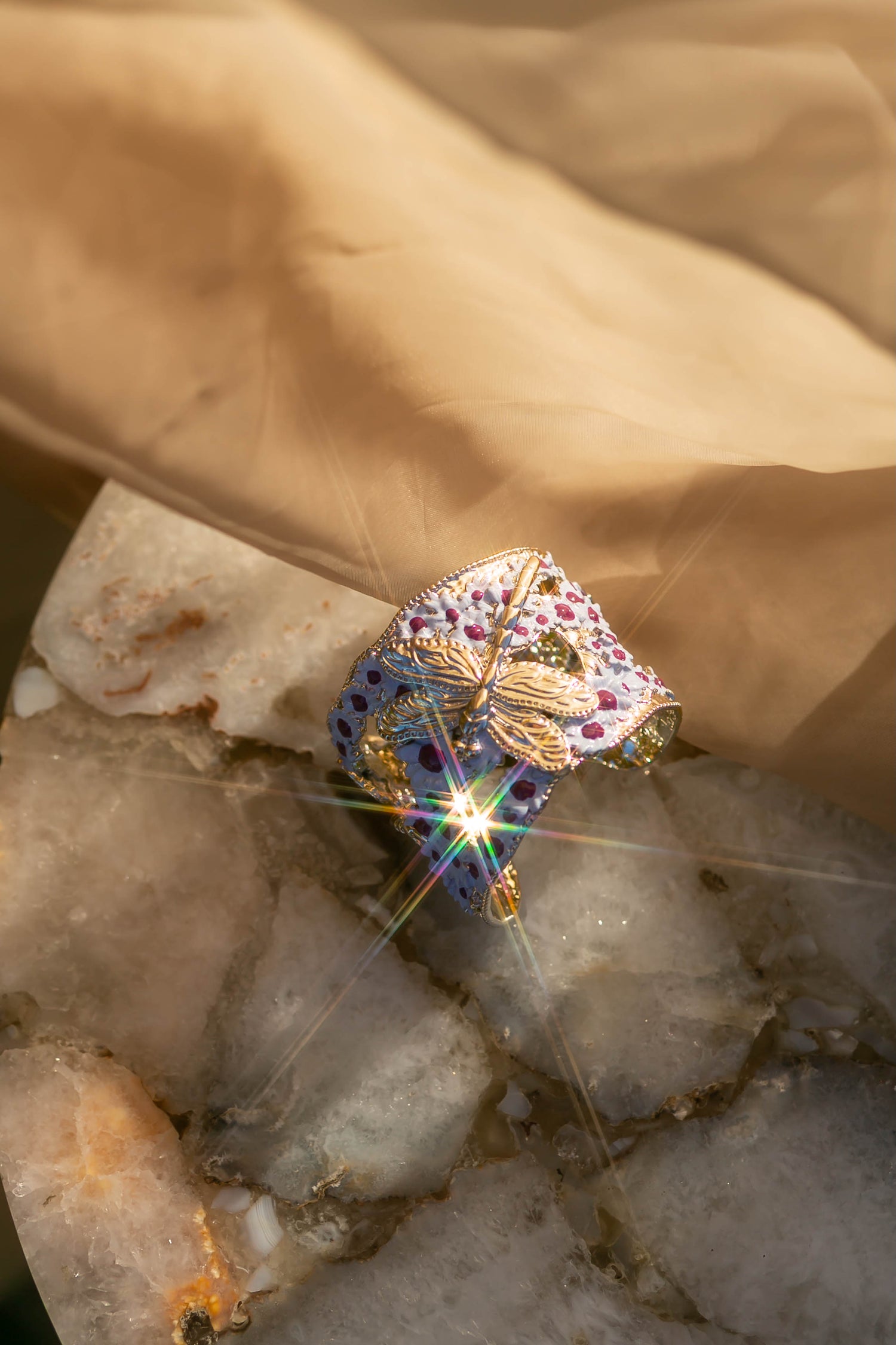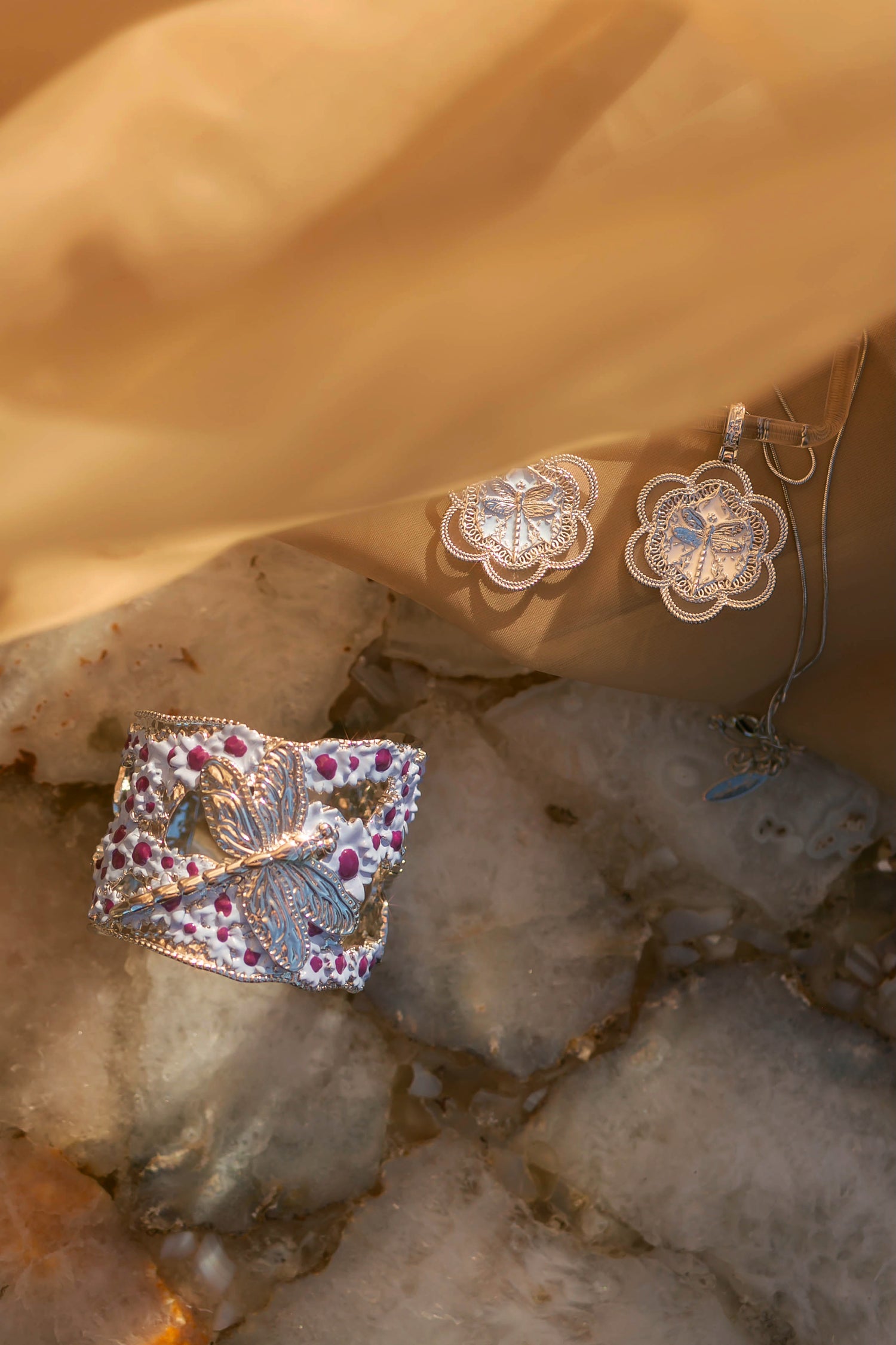 This piece celebrates joy and tells a story of inner peace and connection with nature. A white rhodium dragonfly rests among a garden of powder blue enamel flowers, each one painted by hand. The design captures a sense of playfulness and wonder — a reminder to stay curious and lighthearted.