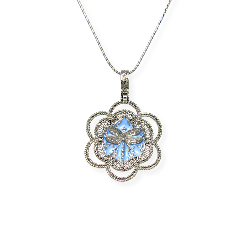 This unique pendant celebrates joy and tells a story of inner peace and connection with nature. A bright white rhodium dragonfly rests among a garden of powder-blue enamel, painted by hand. The design captures a sense of playfulness and wonder — a reminder to stay curious and lighthearted.