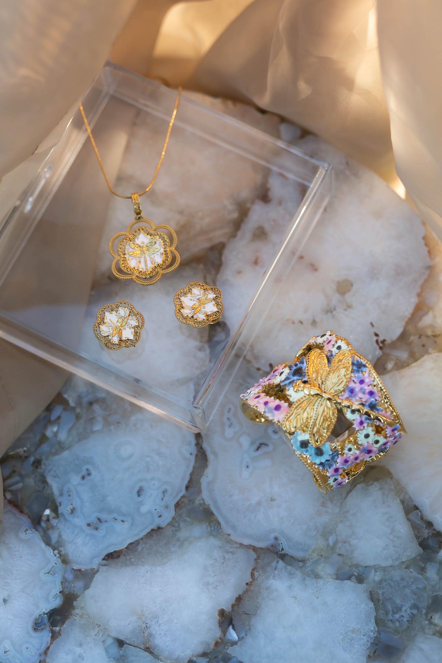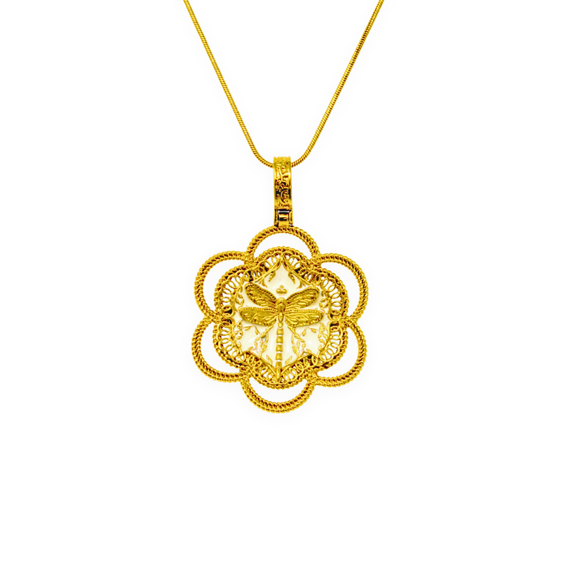This unique piece celebrates joy and tells a story of inner peace and connection with nature. A golden dragonfly rests among a garden of ivory enamel, painted by hand. The design captures a sense of playfulness and wonder — a reminder to stay curious and lighthearted.