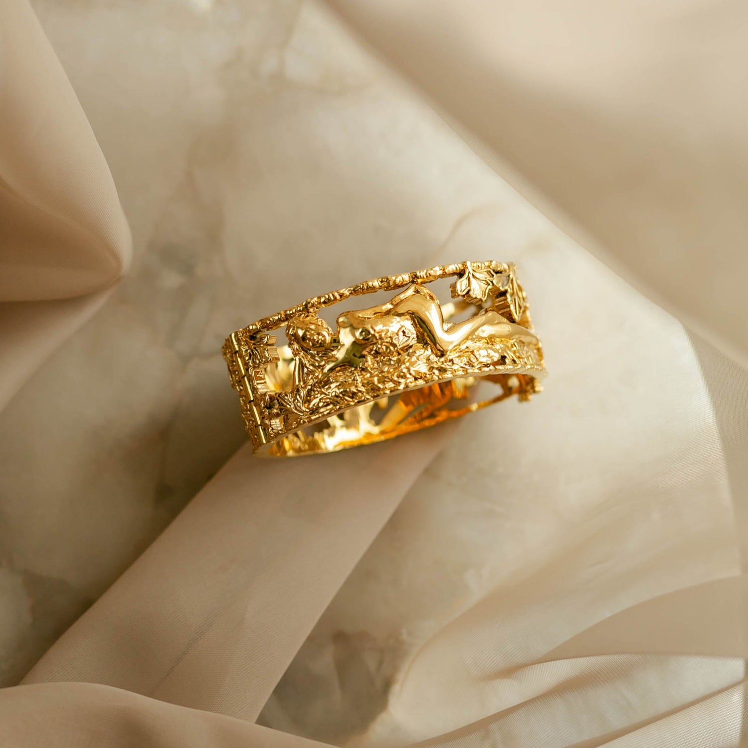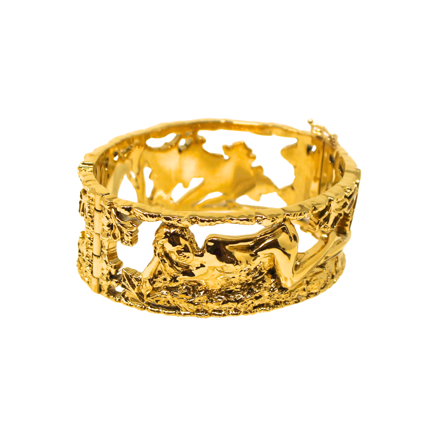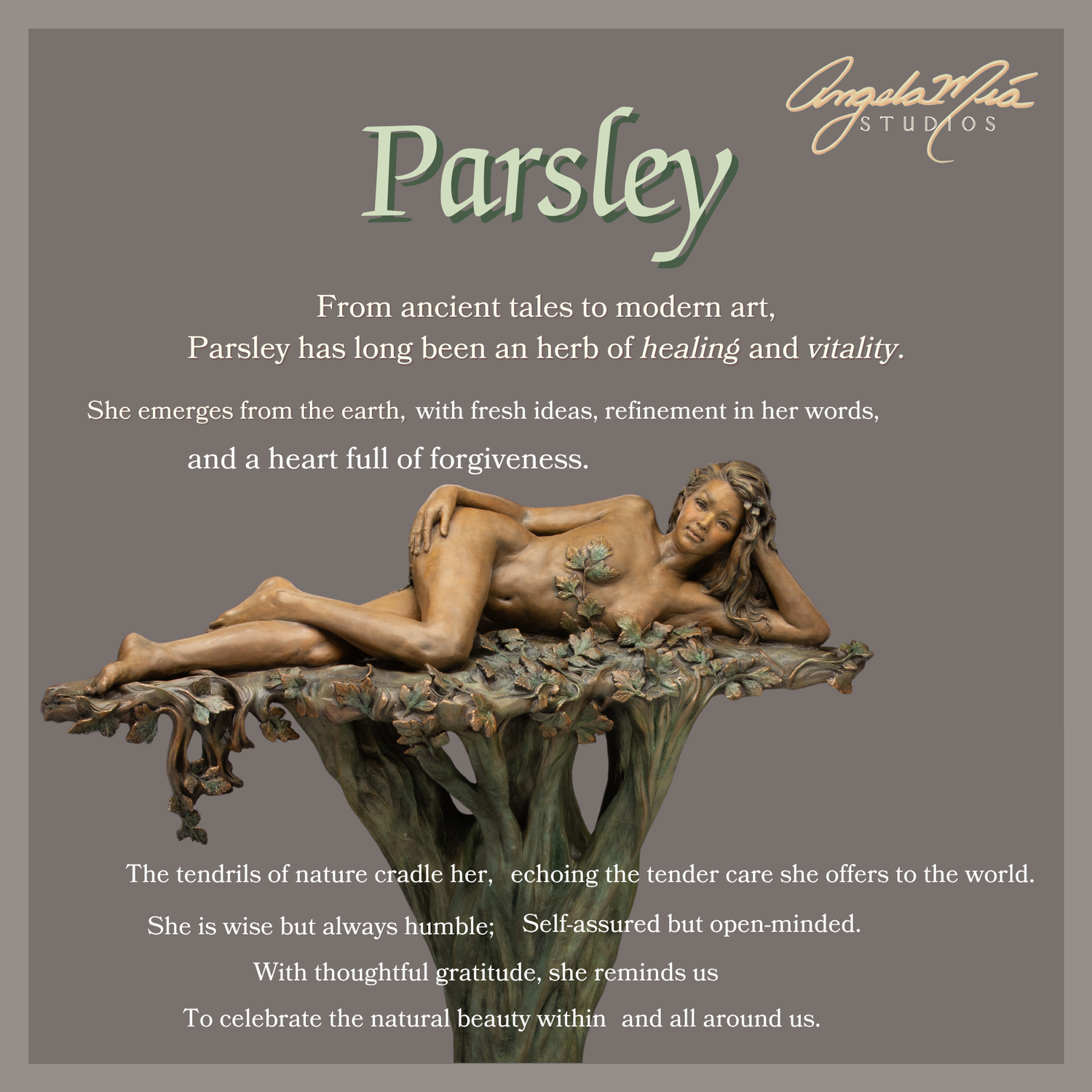 Inspired by Angela Mia’s figurative bronze sculpture, Parsley, this bangle bracelet depicts a graceful woman reclining amidst a bed of parsley, embodying vitality, renewal, and a deep connection to the earth.