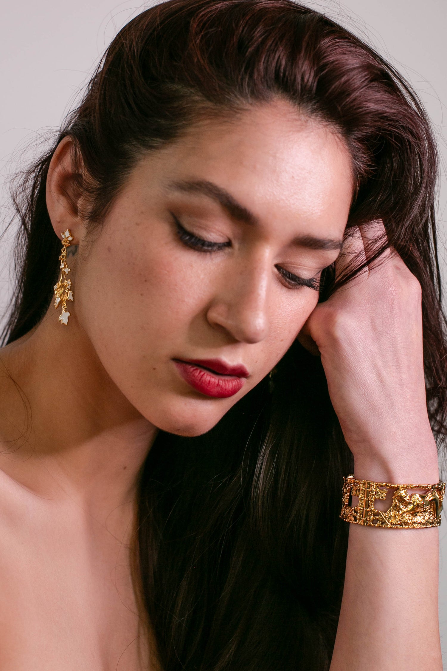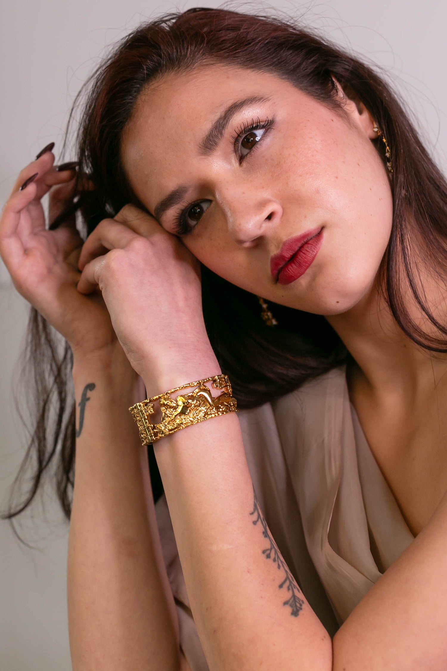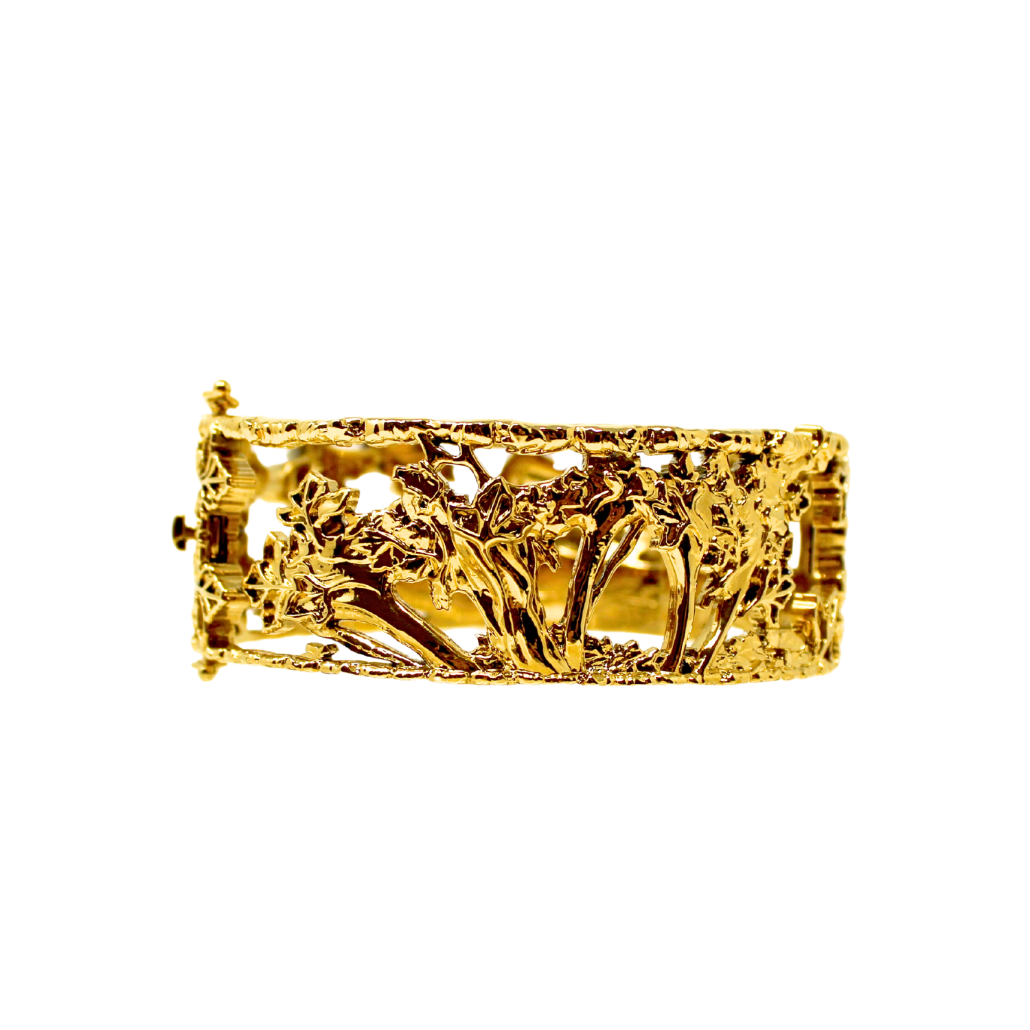 Inspired by Angela Mia’s figurative bronze sculpture, Parsley, this bangle bracelet depicts a graceful woman reclining amidst a bed of parsley, embodying vitality, renewal, and a deep connection to the earth.