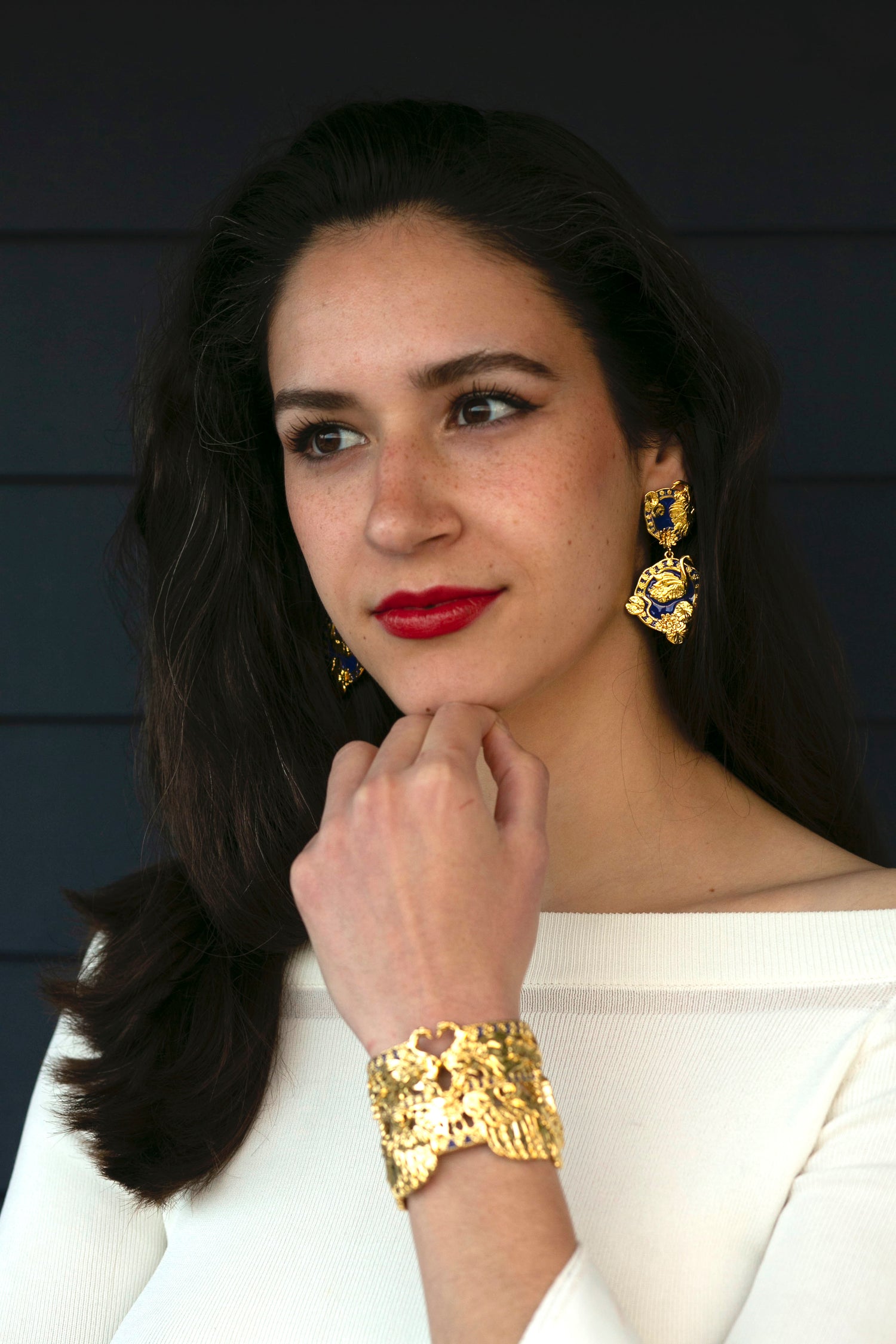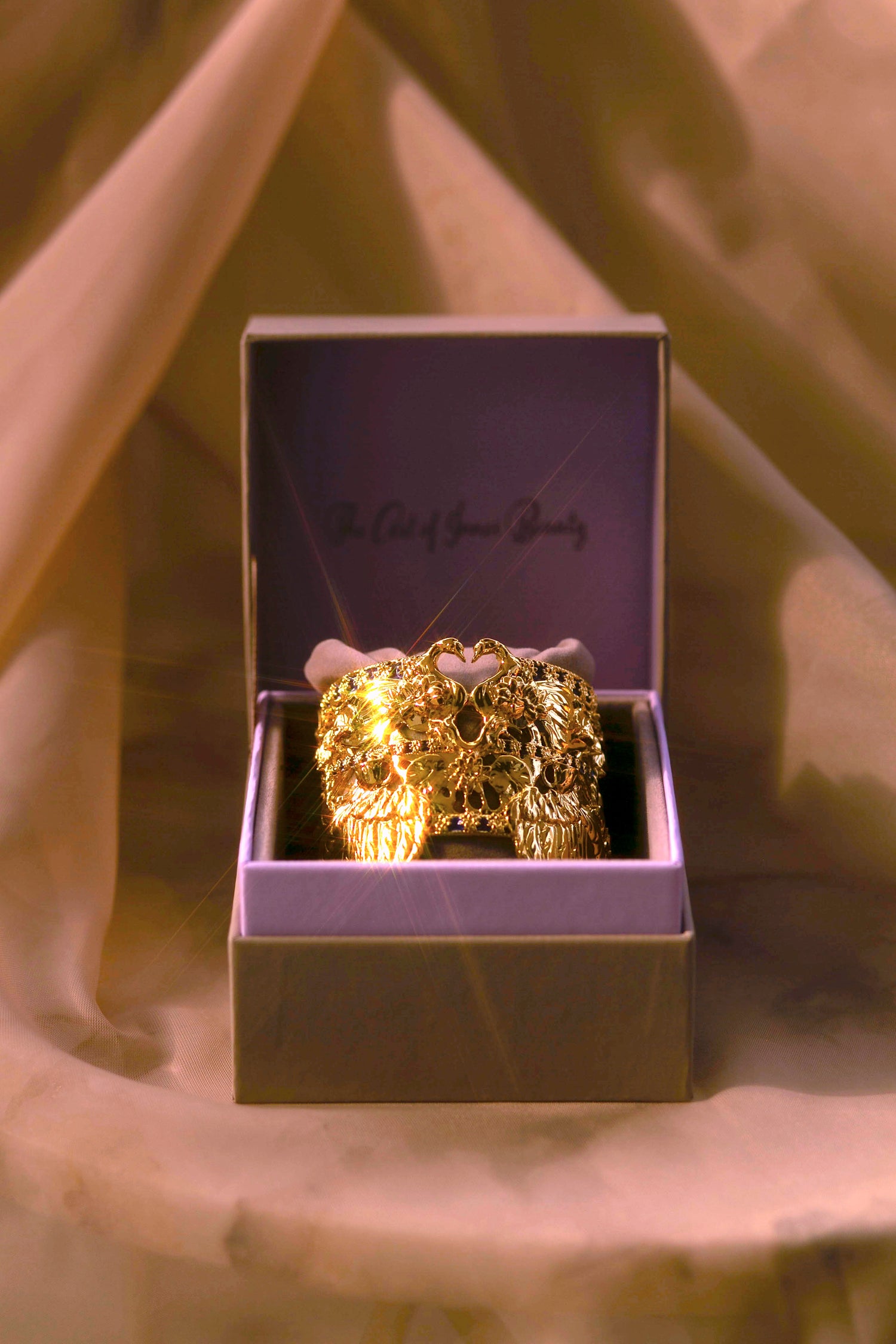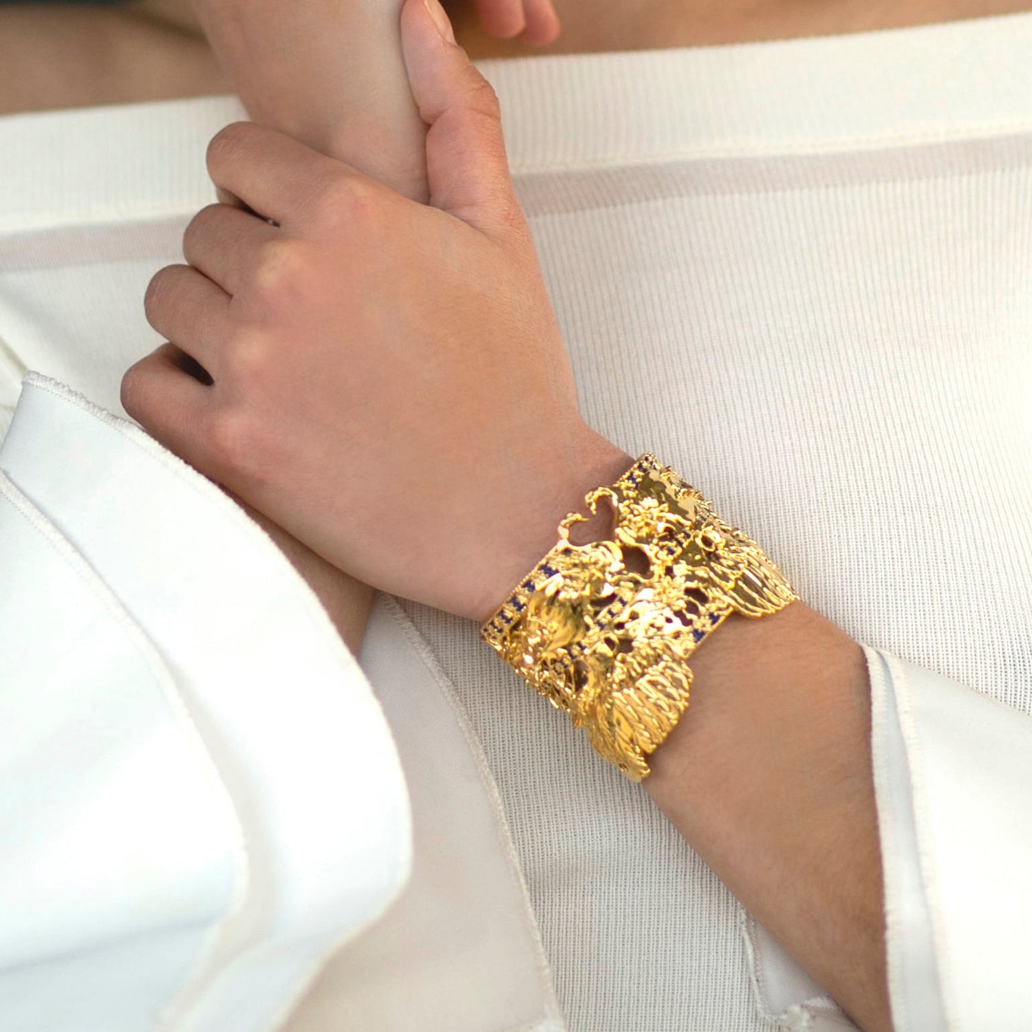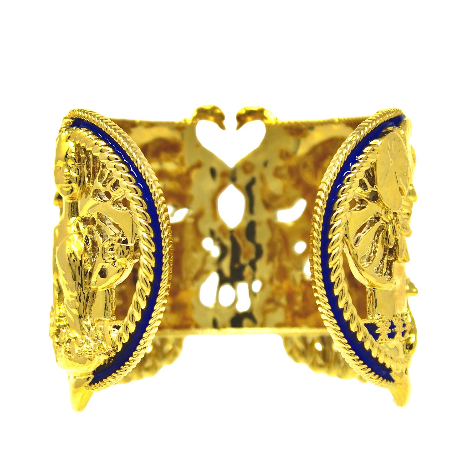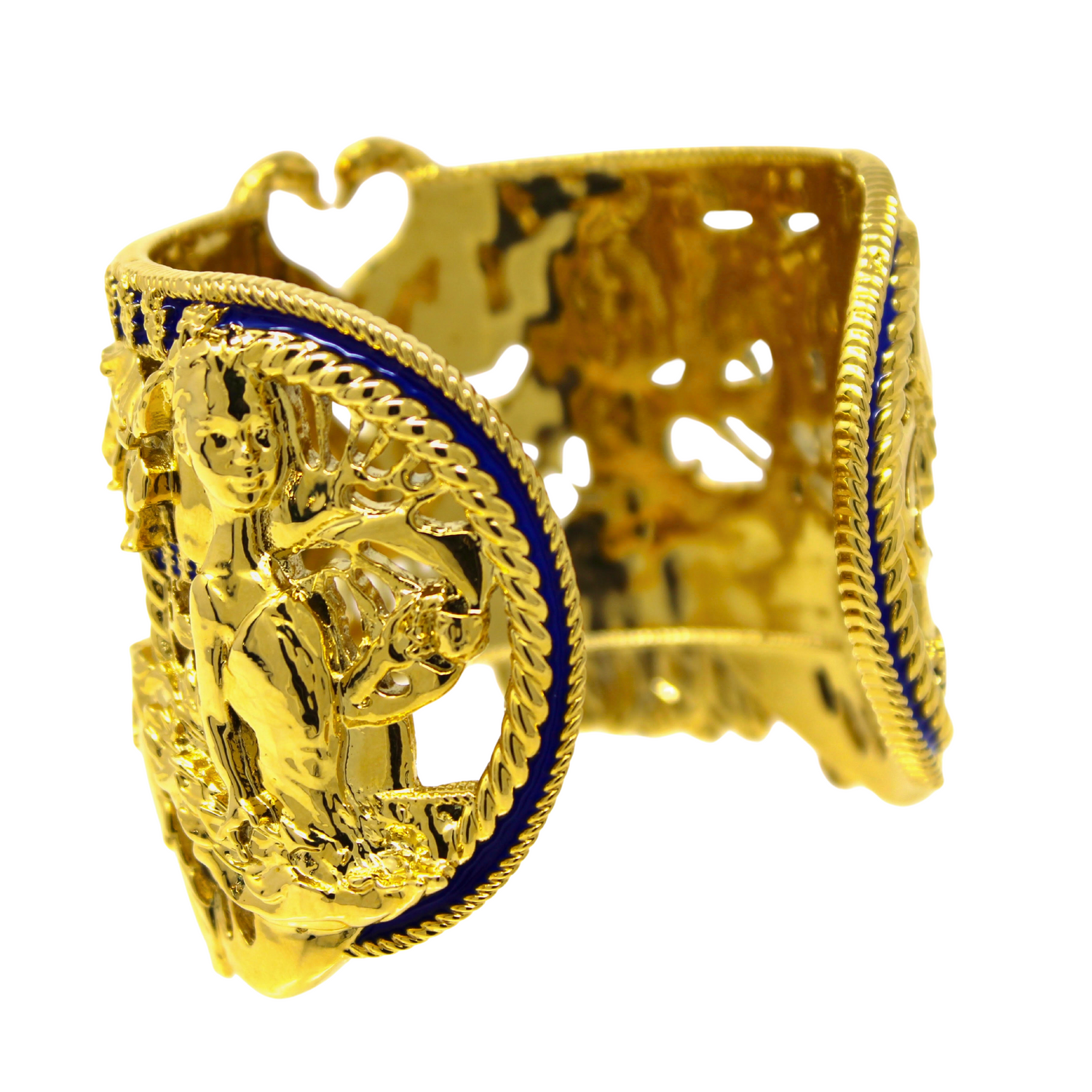 Inspired by Angela Mia's original full-figure sculpture, Tea and Lilies, this bracelet cuff is crafted with 18K gold plating, featuring dark blue enamel edges that accentuate the intricate cut-out details.