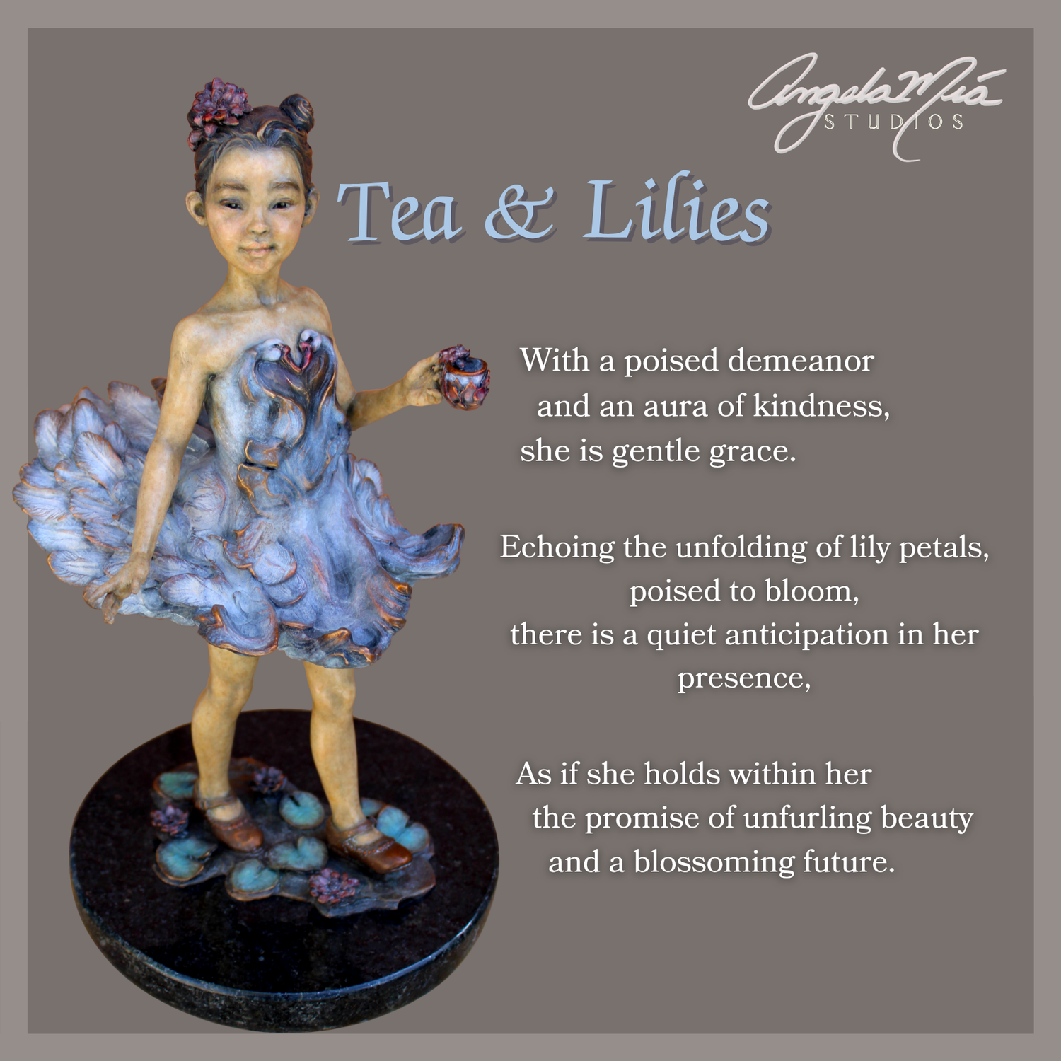 Embodying the spirit of the sculpture, the Tea and Lilies story captures the tender, still moments that are shared between loved ones. The pattern inspired by vintage teacup designs and blooming water lilies surrounds two swans coming together to form a heart.