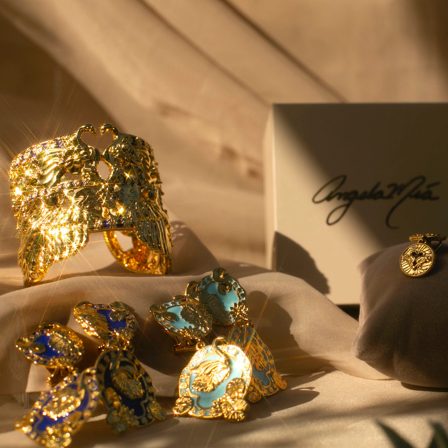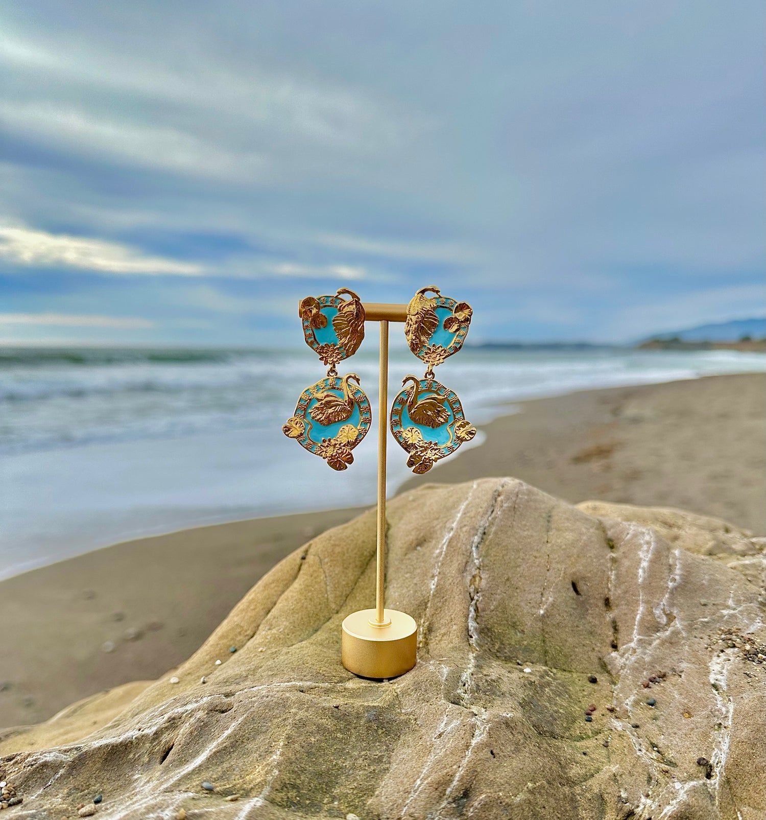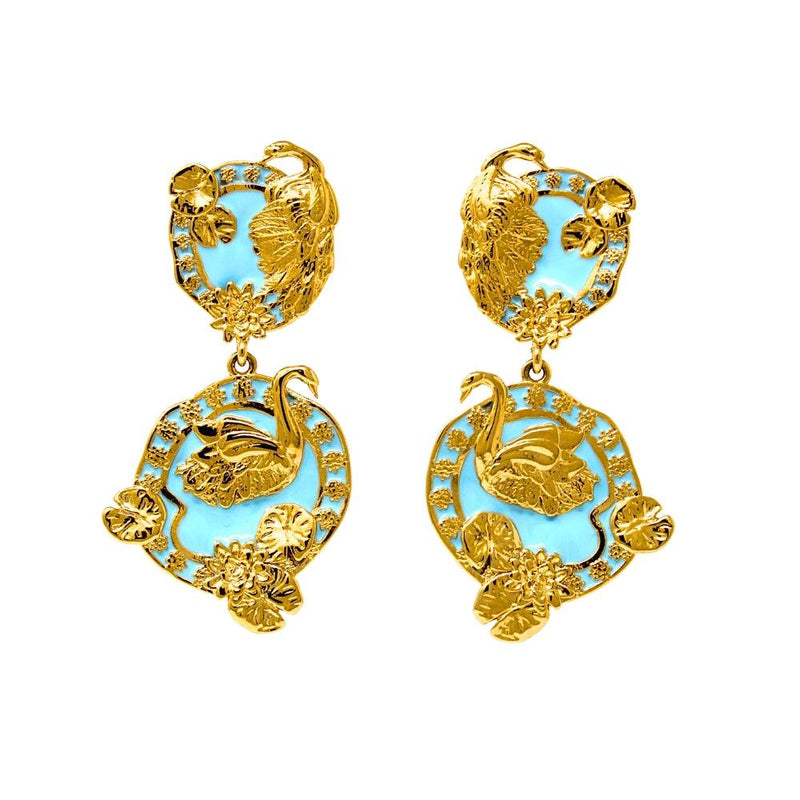 Inspired by Angela Mia's original full-figure sculpture, Tea and Lilies, these earrings are crafted with 18K gold plating and intricate details, featuring hand-painted aquamarine enamel.