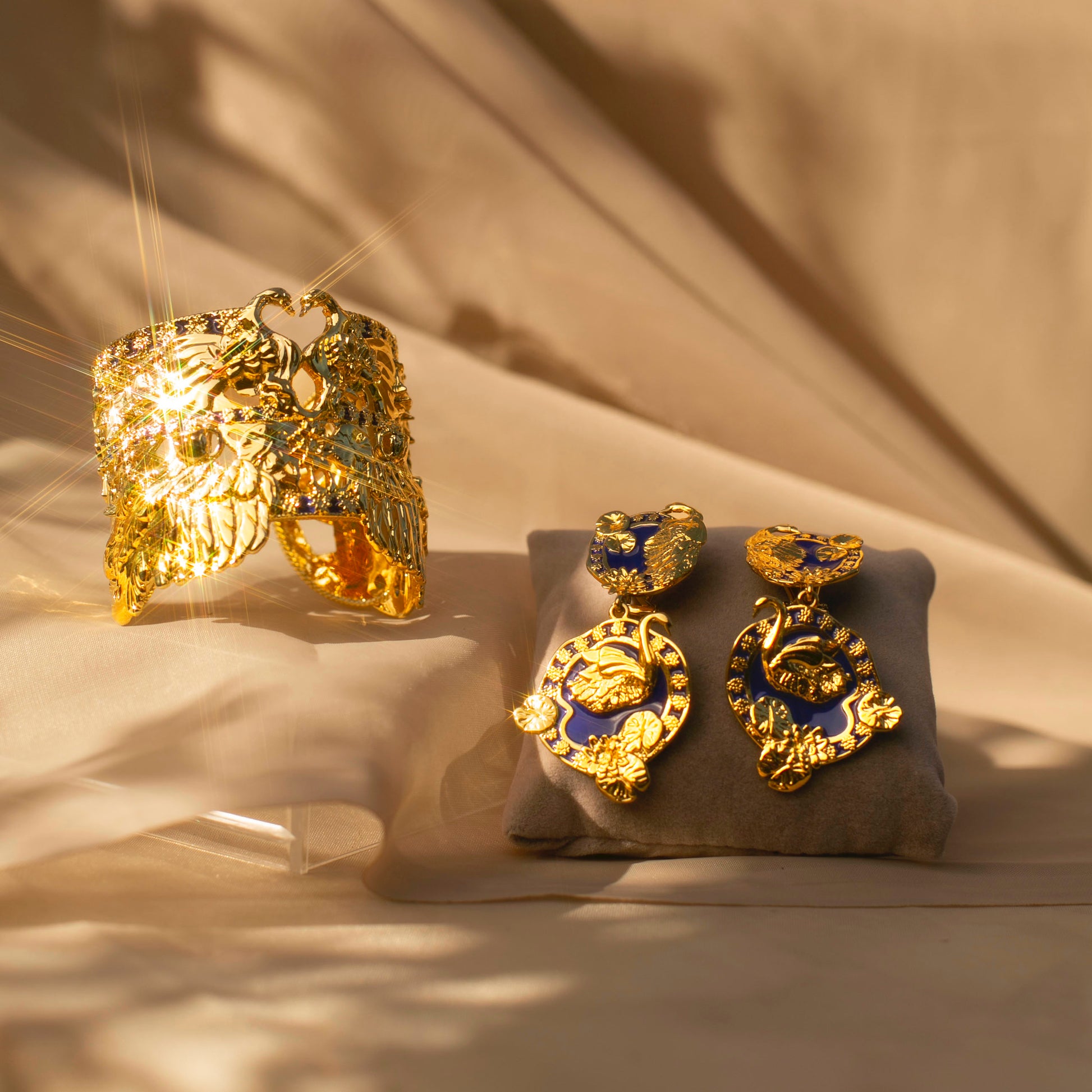 Inspired by Angela Mia's original full-figure sculpture Tea and Lilies, these earrings are crafted with 18K gold plating with intricate details and hand-painted royal blue enamel.
