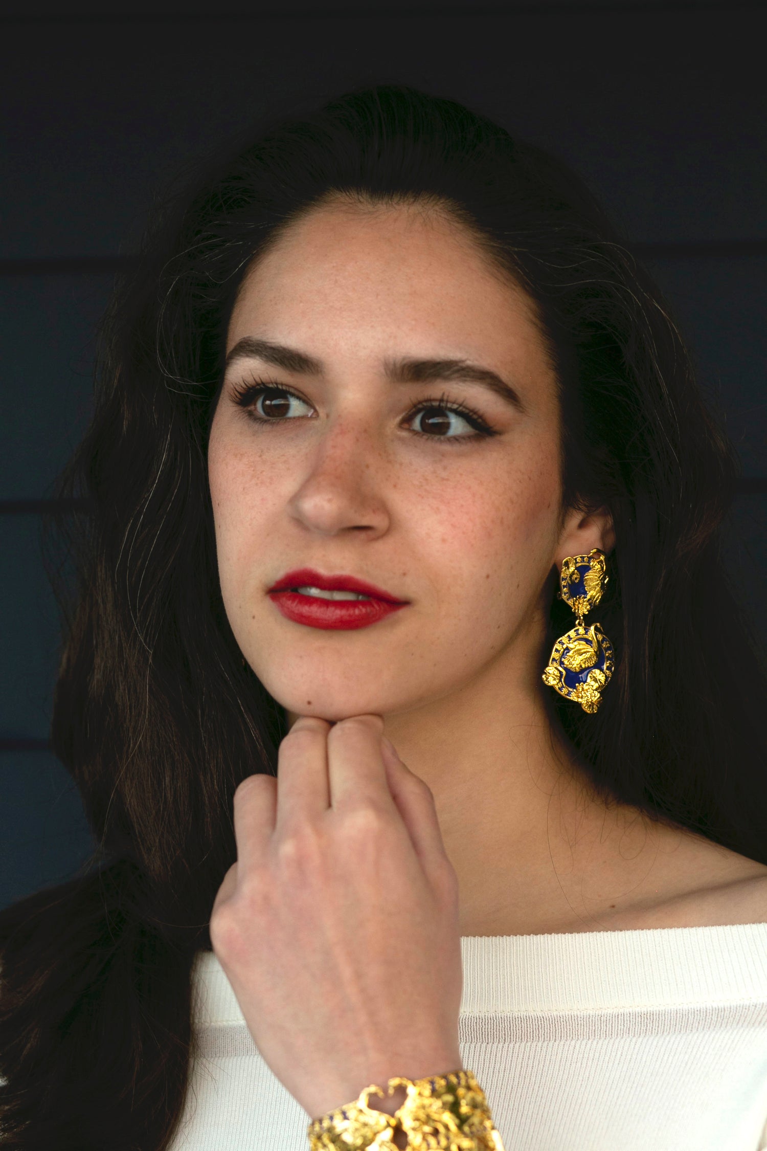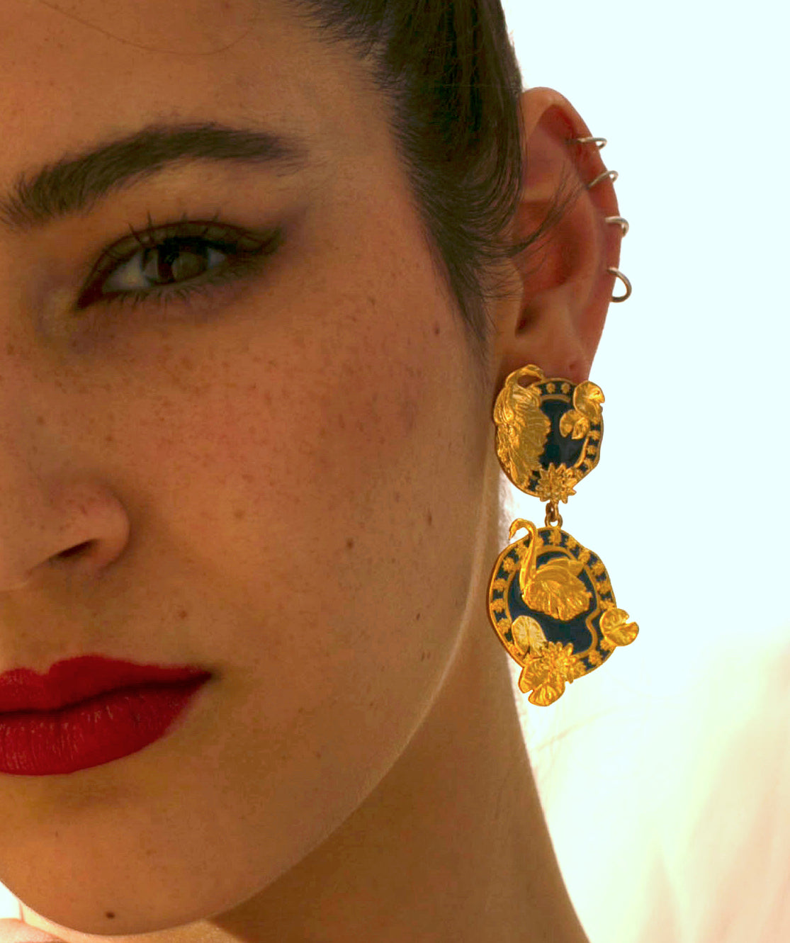 Inspired by Angela Mia's original full-figure sculpture, Tea and Lilies, these earrings are crafted with 18K gold plating and intricate details, featuring hand-painted royal blue enamel.