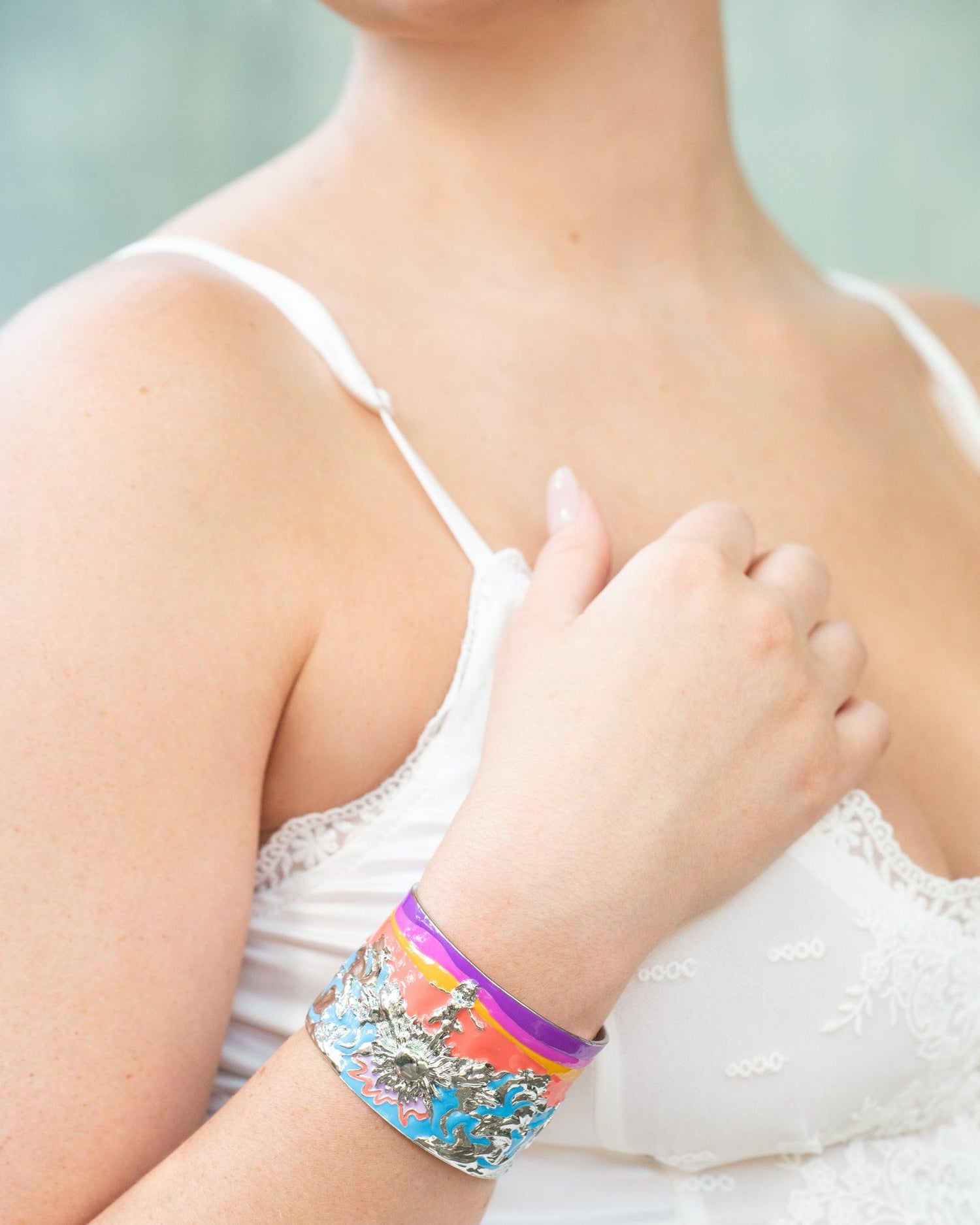Inspired by Angela Mia's original full-figure sculpture, Tomorrow’s Glory, this bracelet cuff is crafted with white rhodium plate and hand-painted enamel.