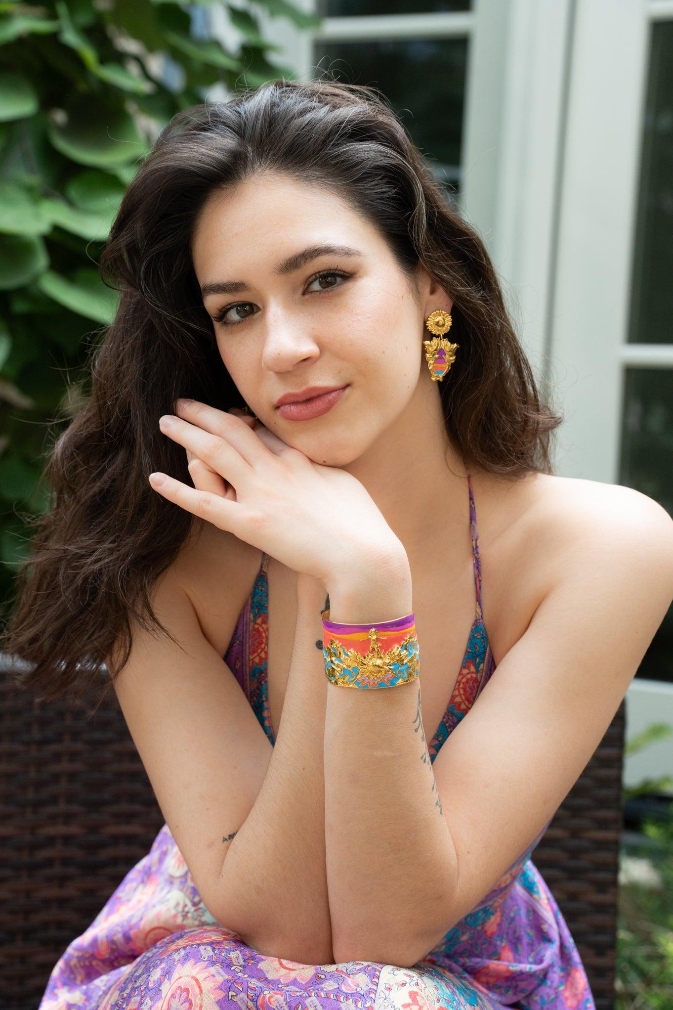 Inspired by Angela Mia's original full-figure sculpture, Tomorrow’s Glory, these earrings are crafted with 18k gold plate and hand-painted enamel.