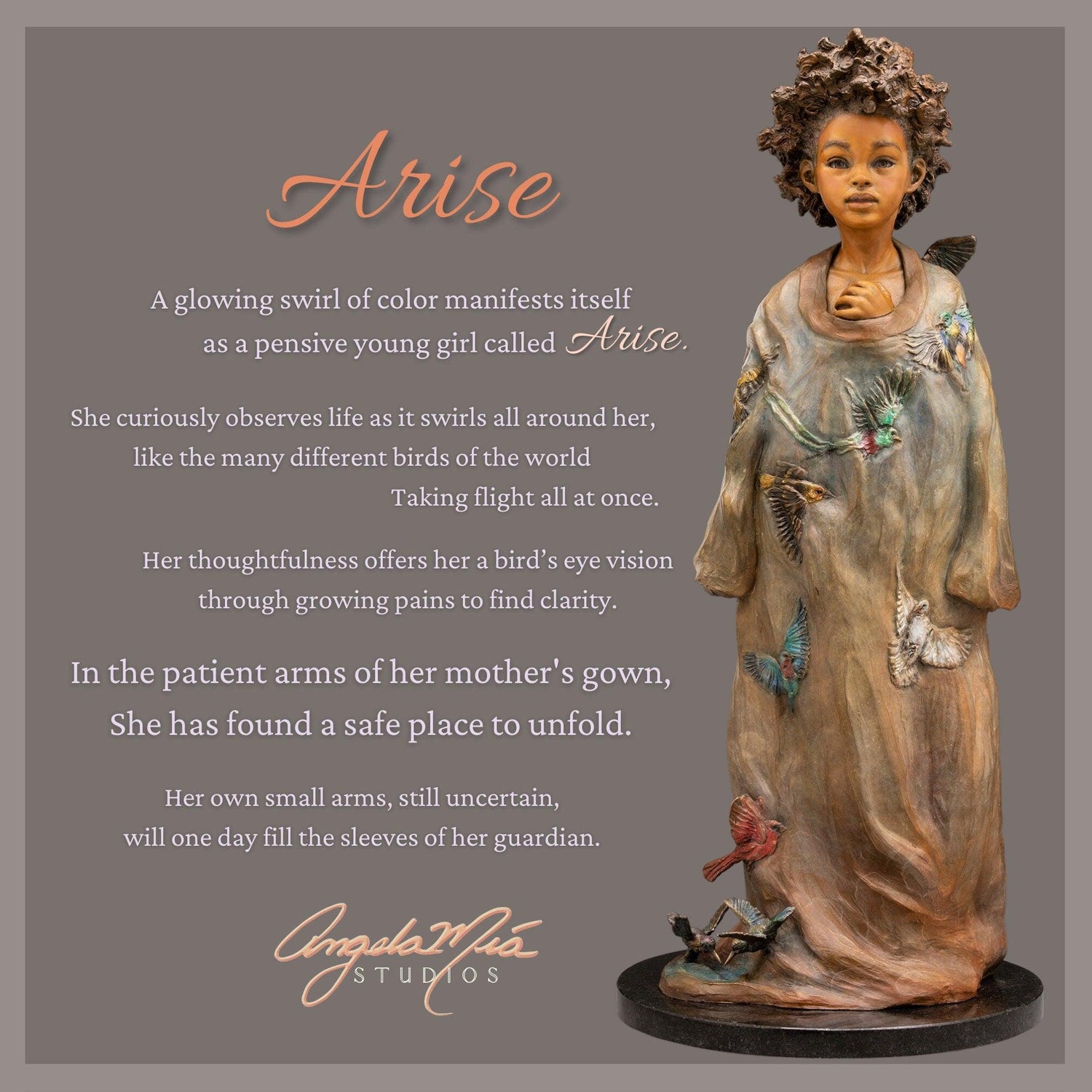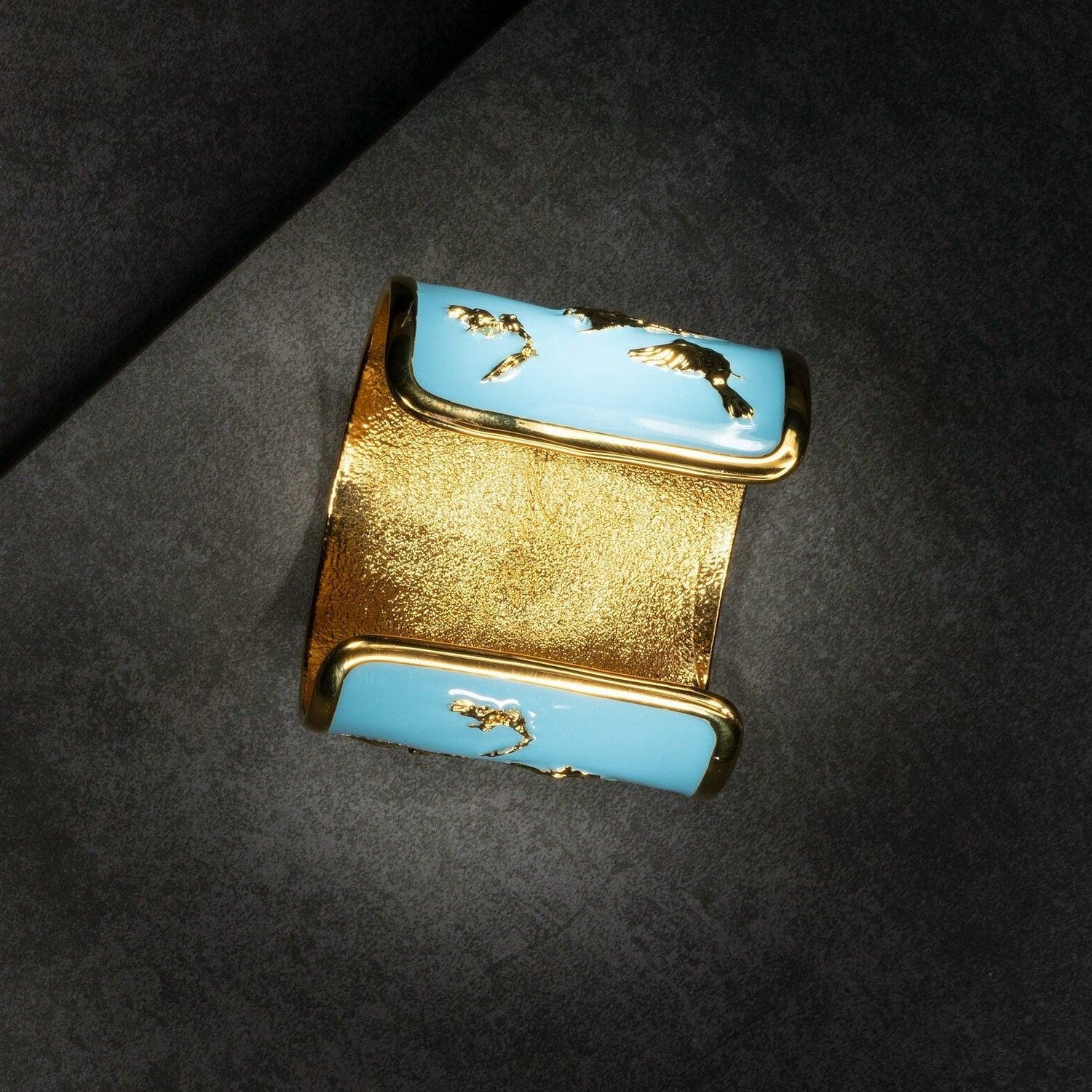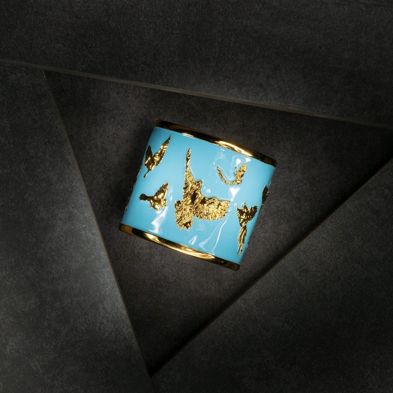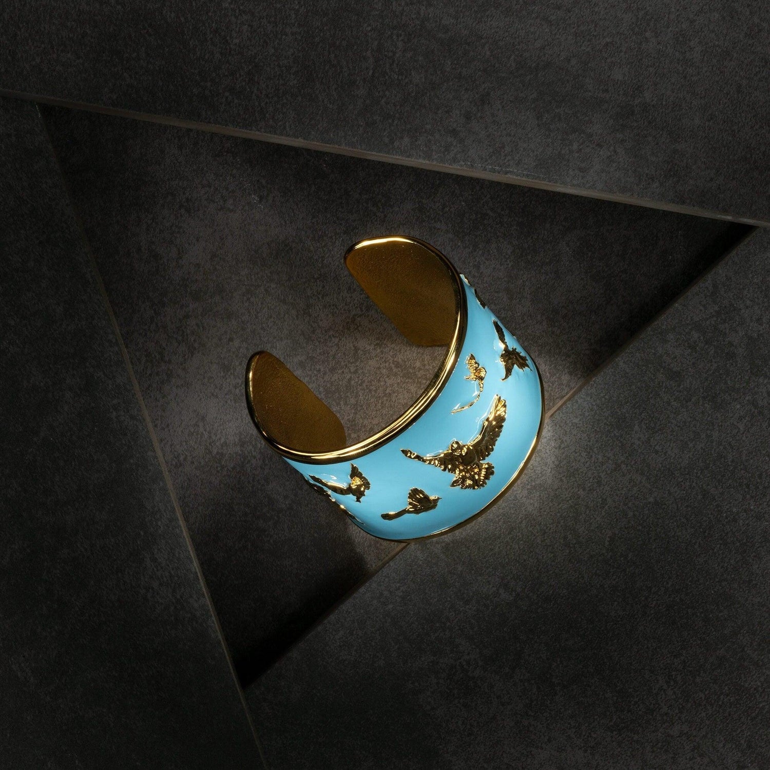 Inspired by Angela Mia's original full-figure sculpture Arise, this 18K gold-plated bracelet cuff features birds of the world taking flight, set against a hand-painted enamel backdrop of a vibrant blue sky.