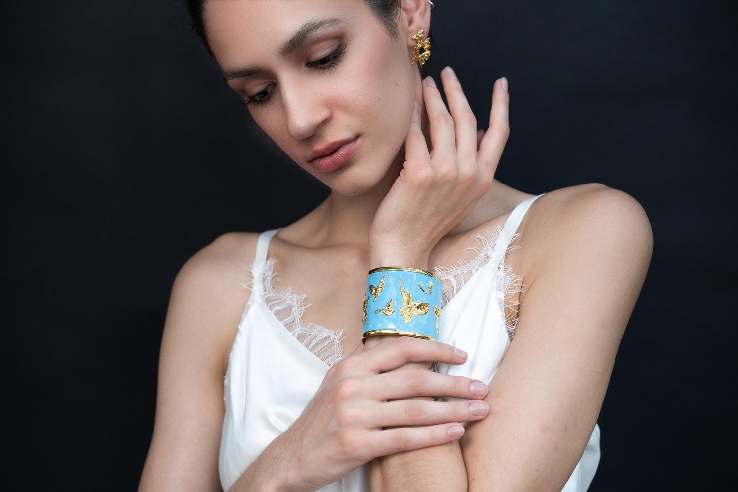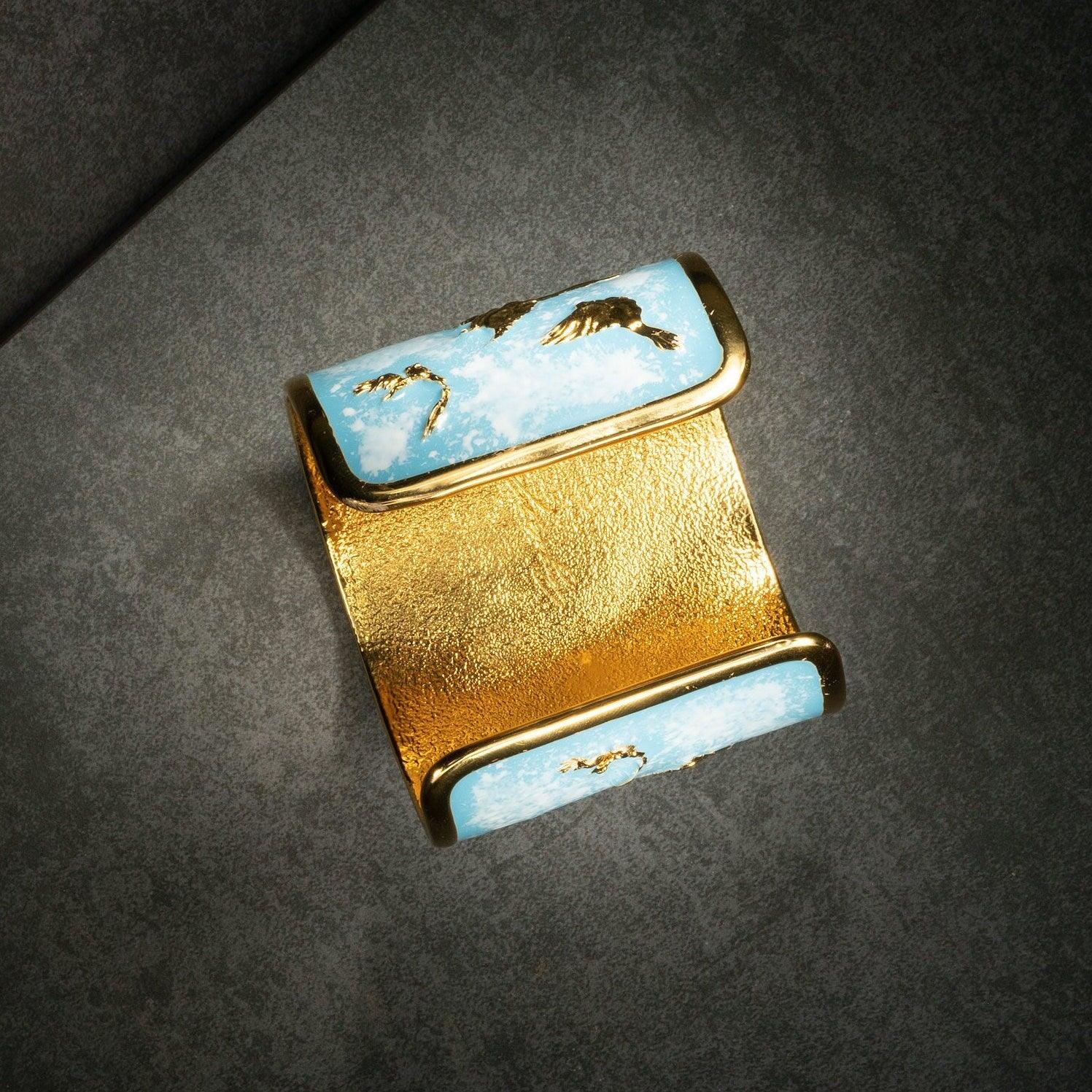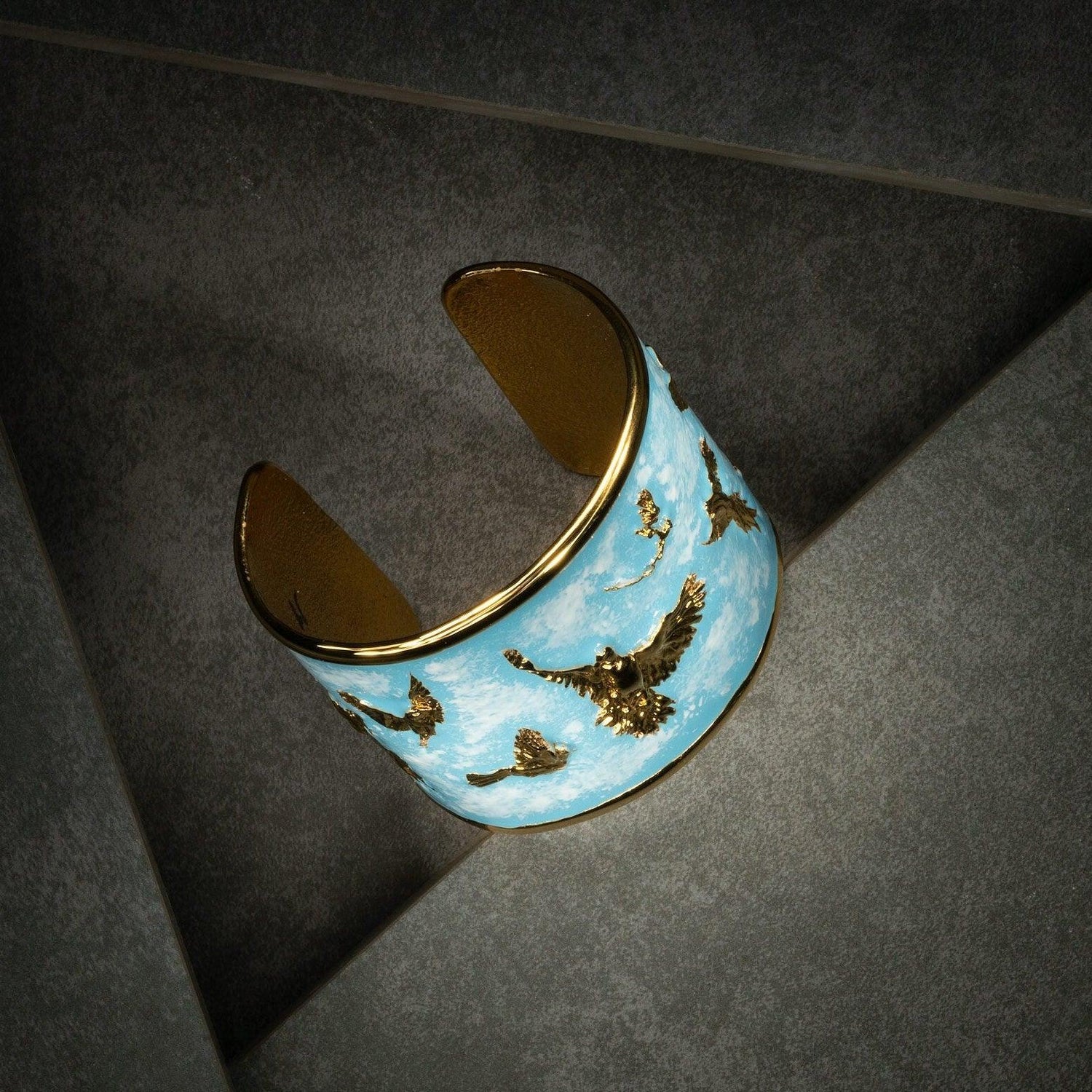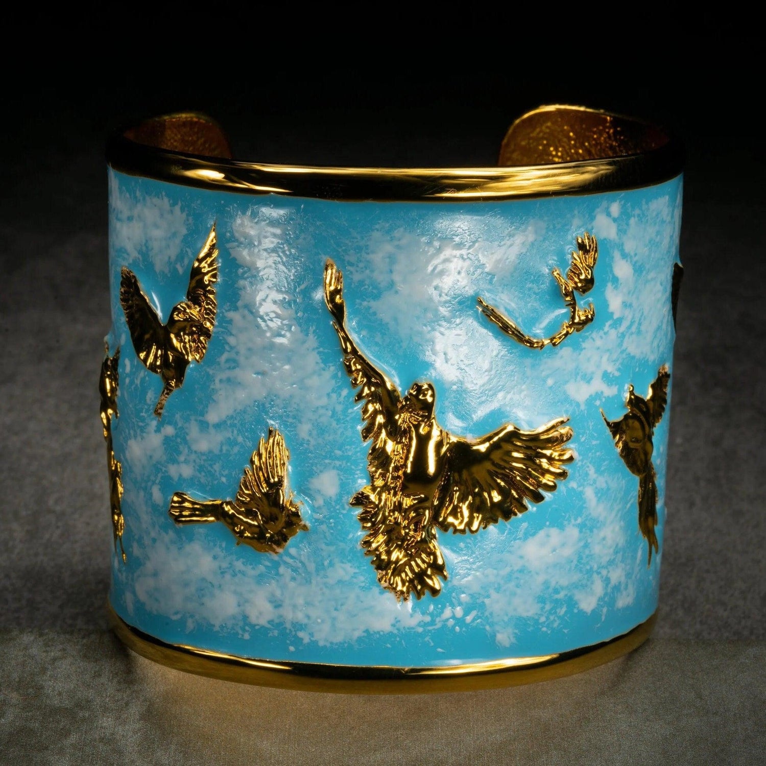 Inspired by Angela Mia's original full-figure sculpture Arise, this 18K gold-plated bracelet cuff features birds of the world taking flight, set against a hand-painted enamel backdrop of a blue sky and fluffy white clouds.