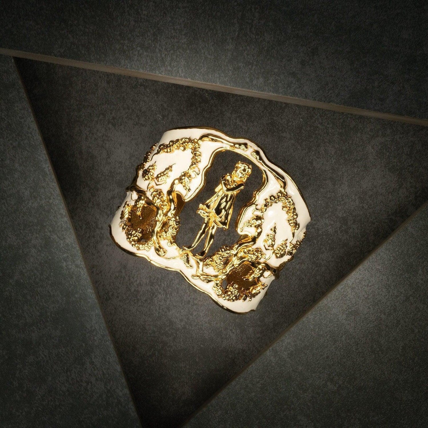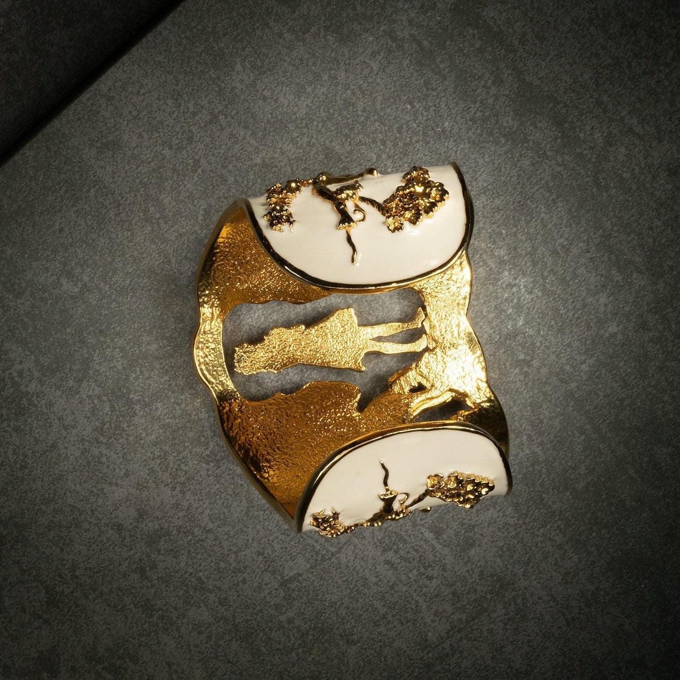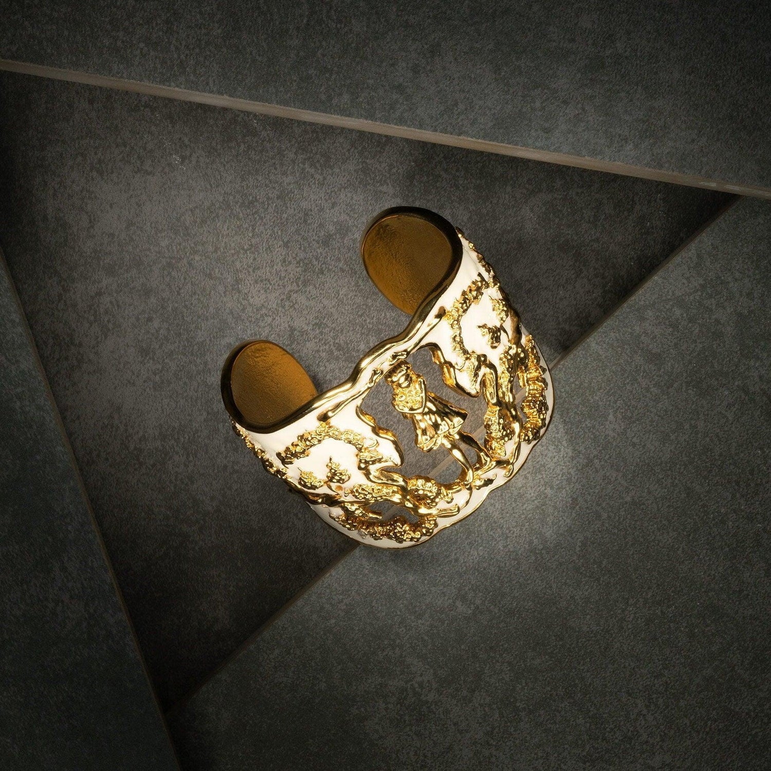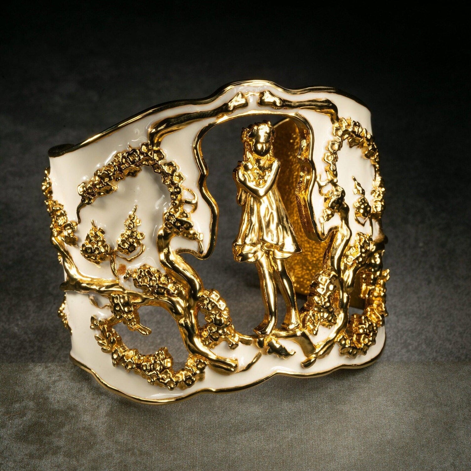 Inspired by Angela Mia's bronze sculpture Harmony, this exquisite bracelet cuff is crafted with 18K gold plating and adorned with an enchanting hand-painted ivory enamel finish.