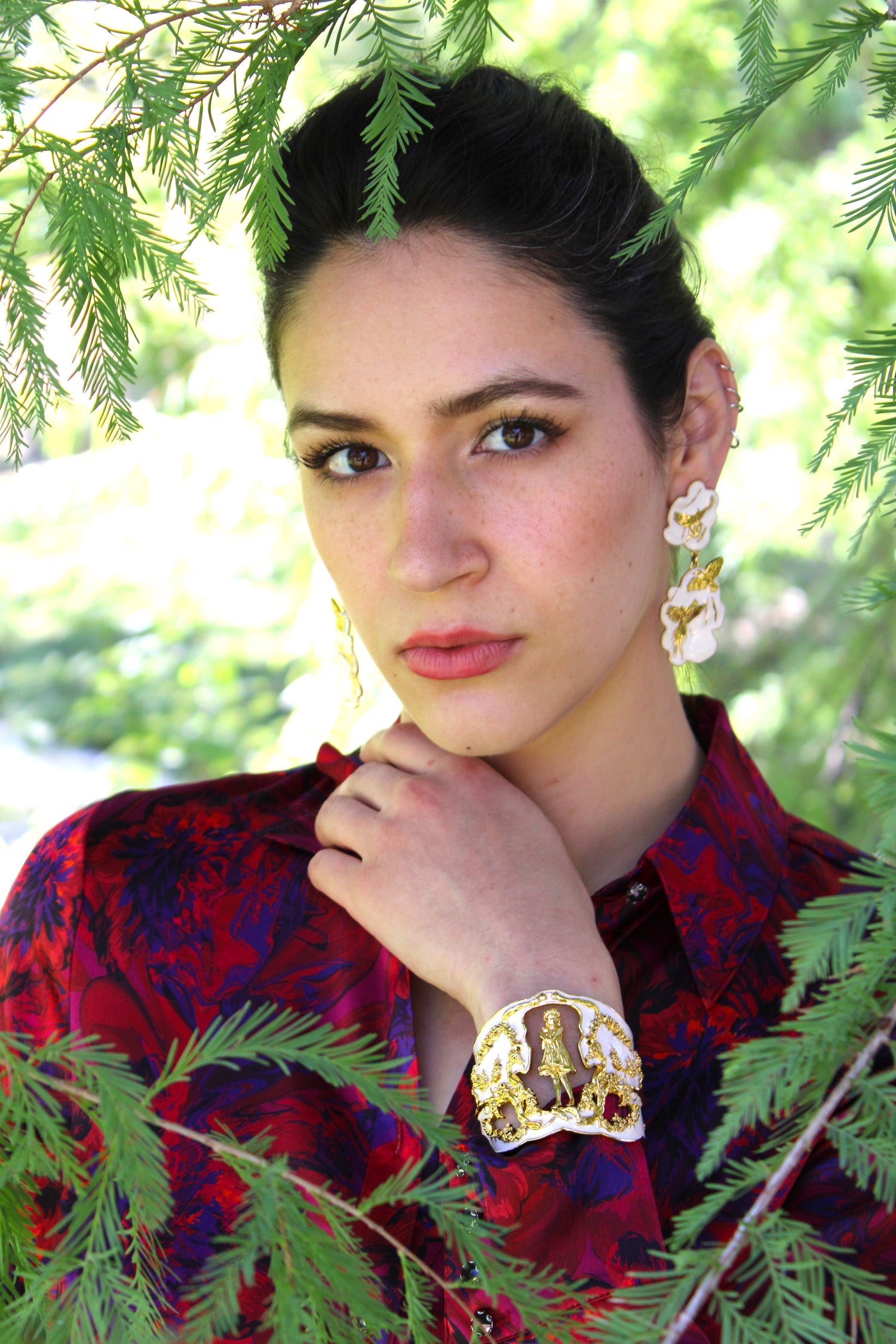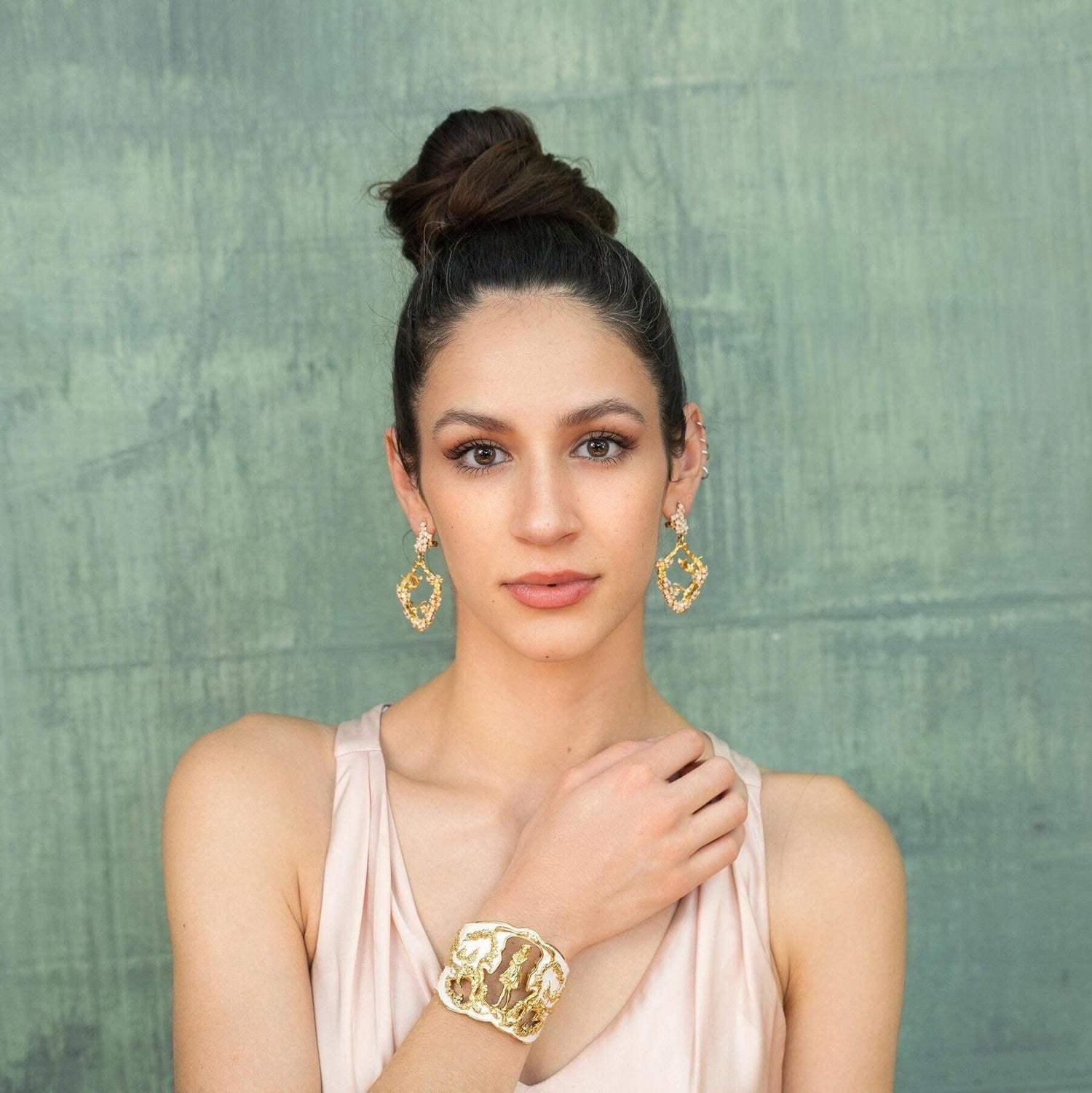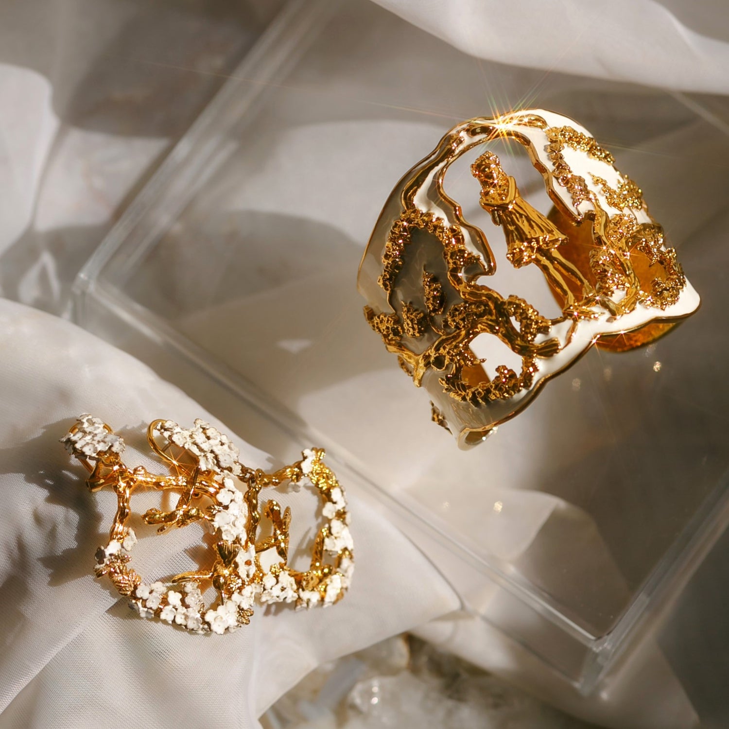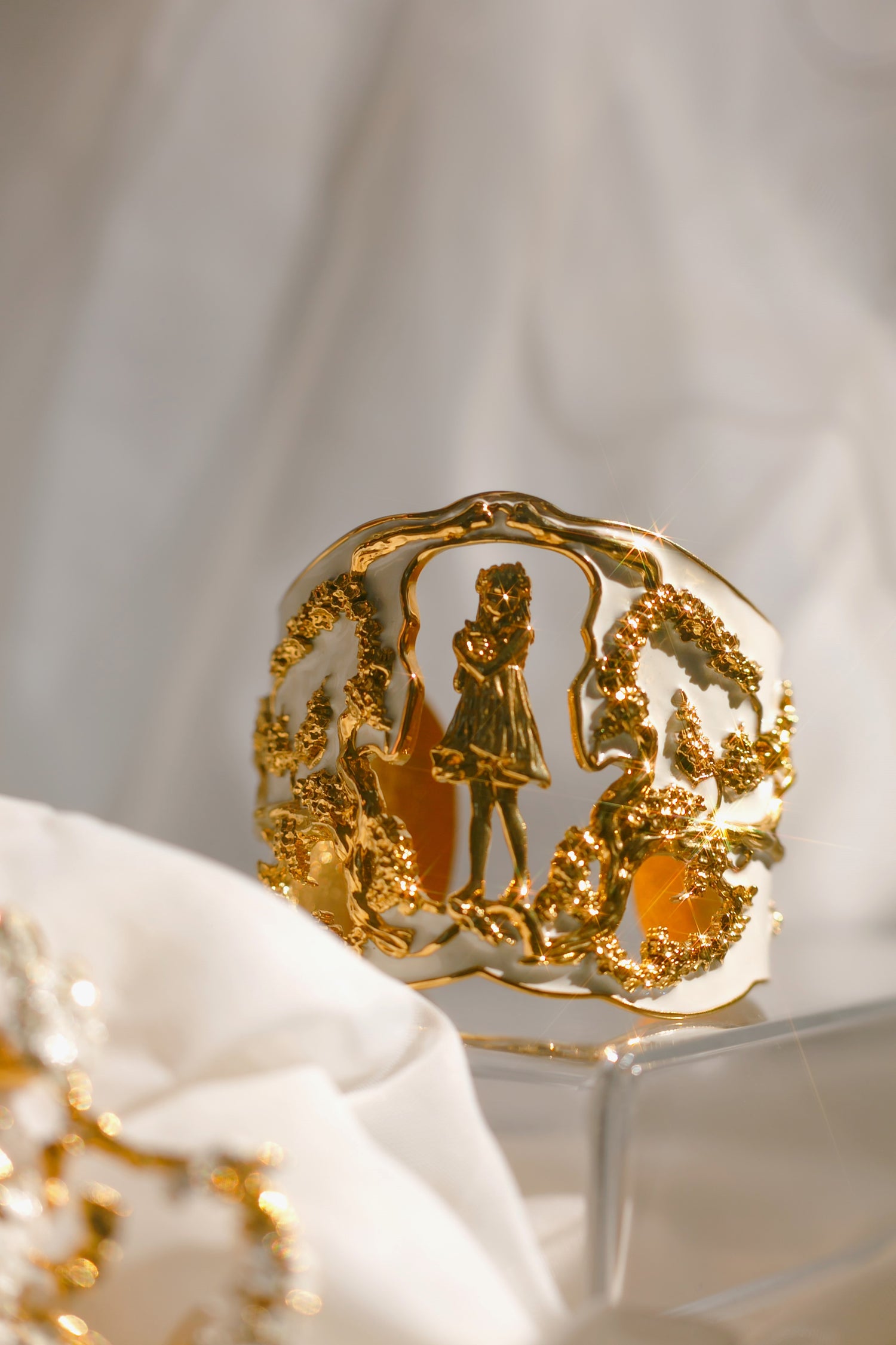 Inspired by Angela Mia's bronze sculpture Harmony, this exquisite bracelet cuff is crafted with 18K gold plating and adorned with an enchanting hand-painted ivory enamel finish.