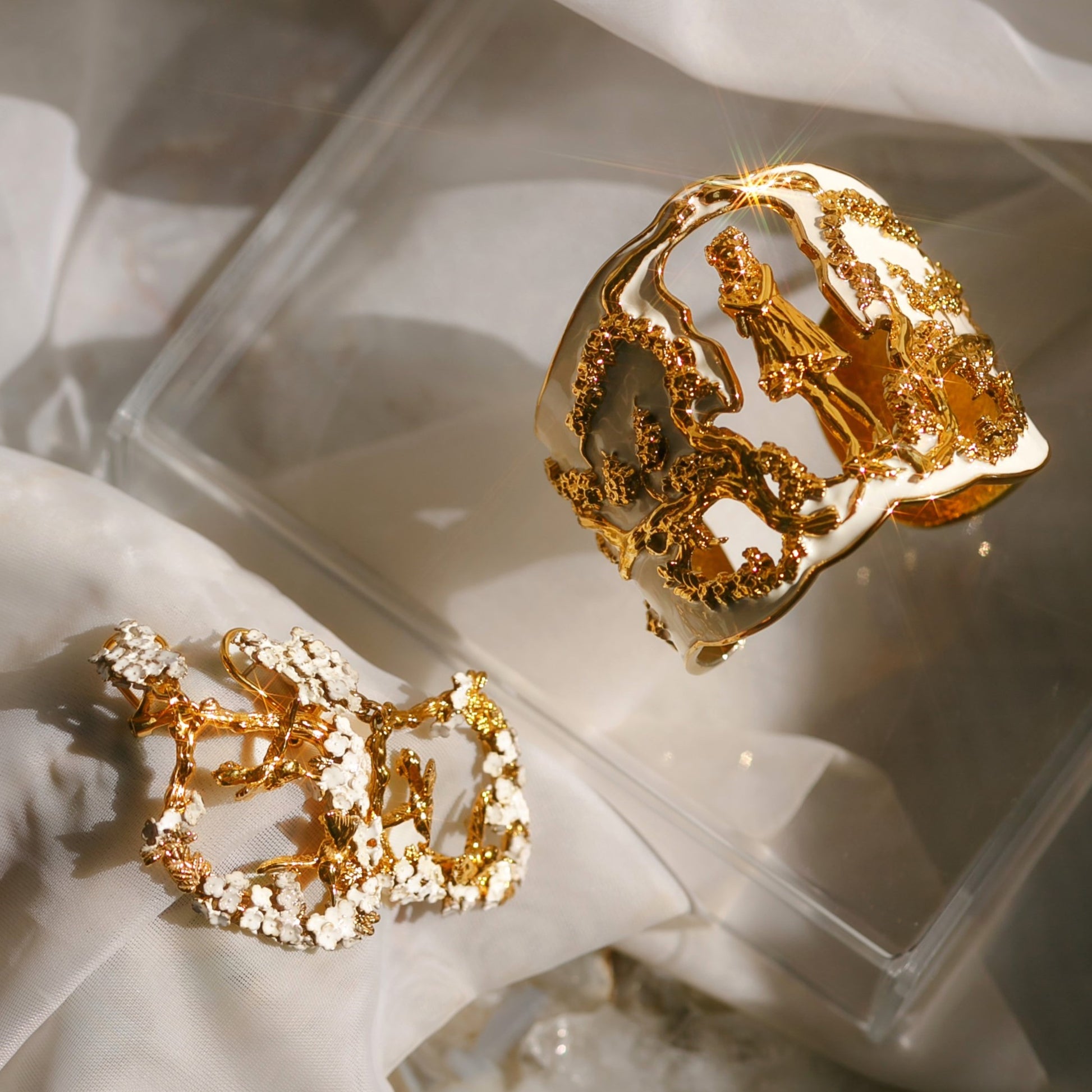 Inspired by Angela Mia's bronze sculpture Harmony , this exquisite bracelet cuff is crafted with 18K gold plating and adorned with an enchanting hand-painted ivory enamel finish.
