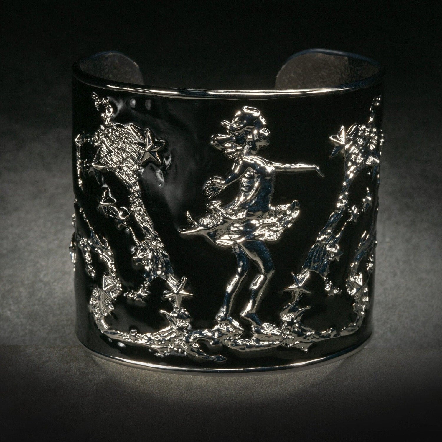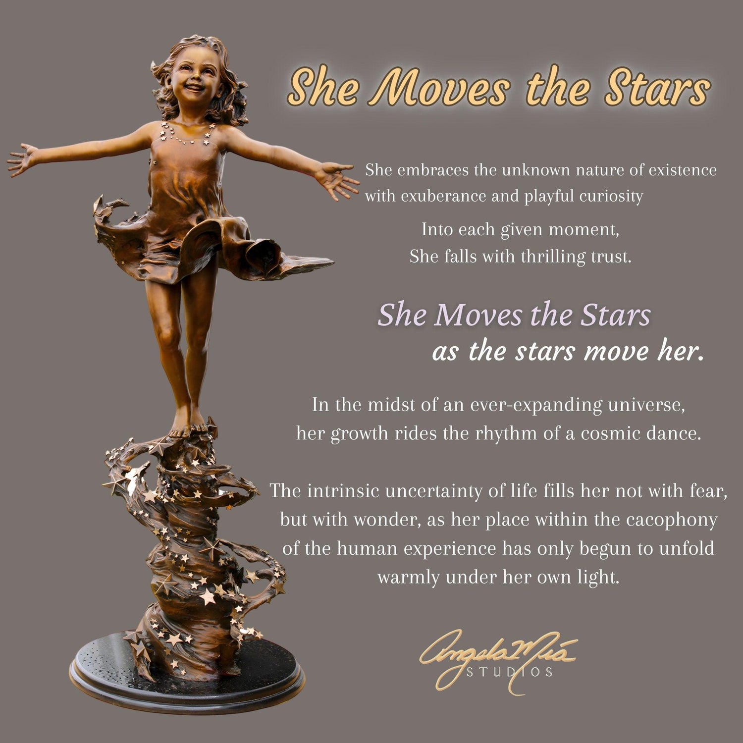 Inspired by Angela Mia's full-figure sculpture She Moves The Stars, this bracelet cuff captures the joy of a beautiful child who believes in herself so much, she possesses the remarkable ability to move the stars!
