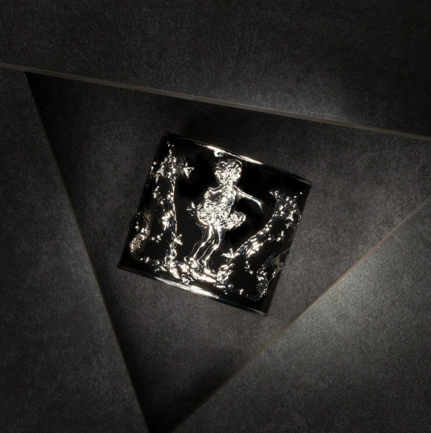 Crafted with white rhodium plating and adorned with a striking hand-painted black enamel finish, the bold color contrast evokes a sense of Baroque style, while preserving the uplifting spirit of Angela Mia’s original sculpture.