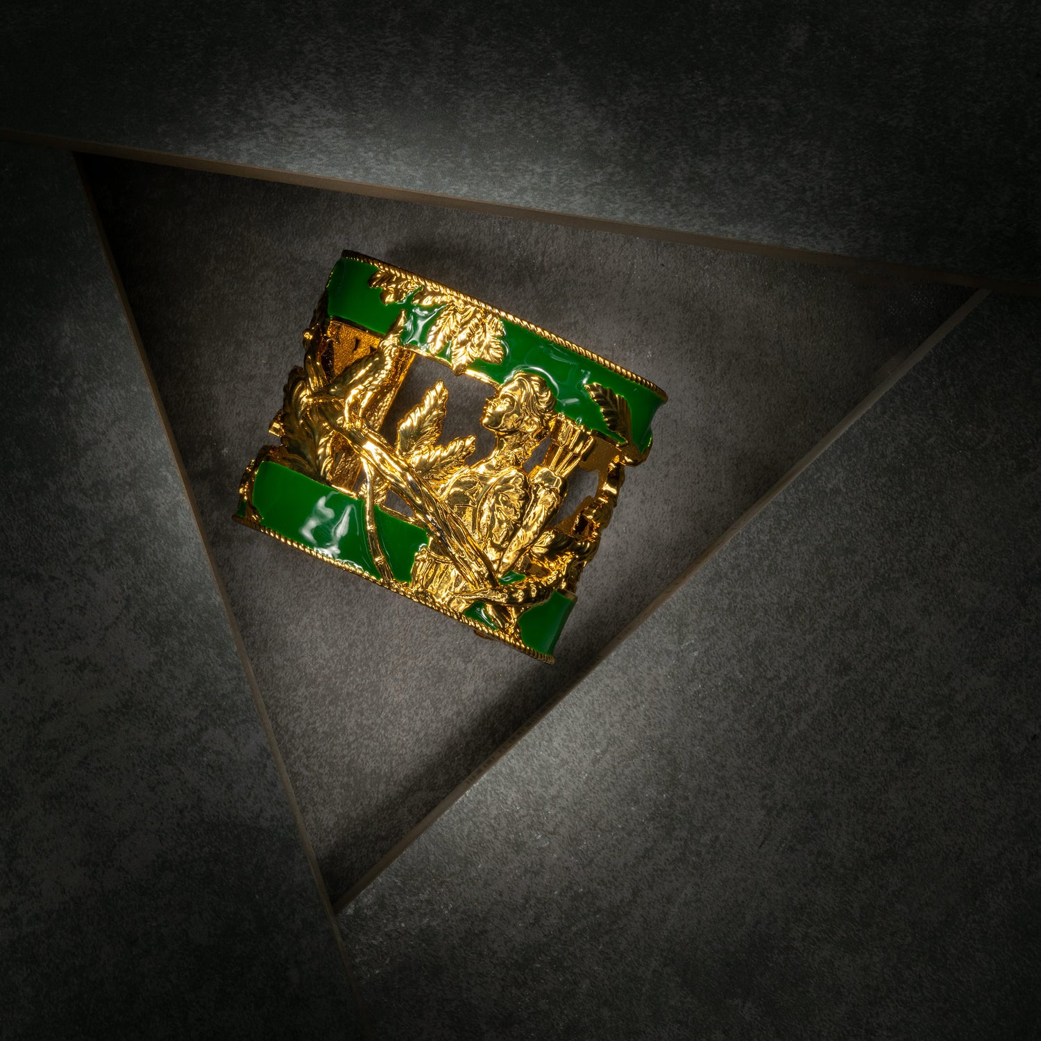 Crafted with 18K gold plate and adorned with a deep forest green enamel, the Vigor bracelet cuff serves as a reminder to remain steadfast in embracing your true self, while projecting an aura of respect and dignity.