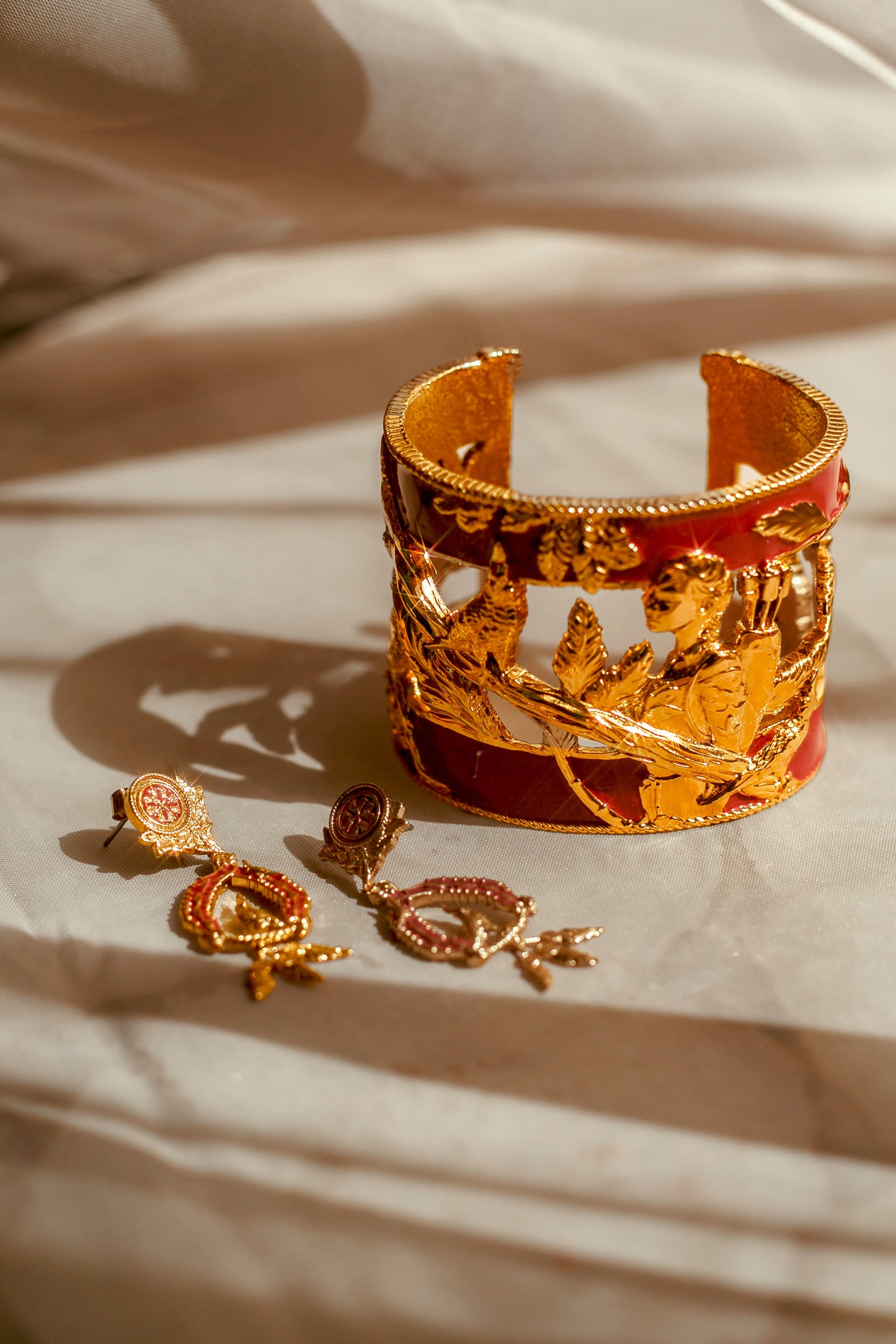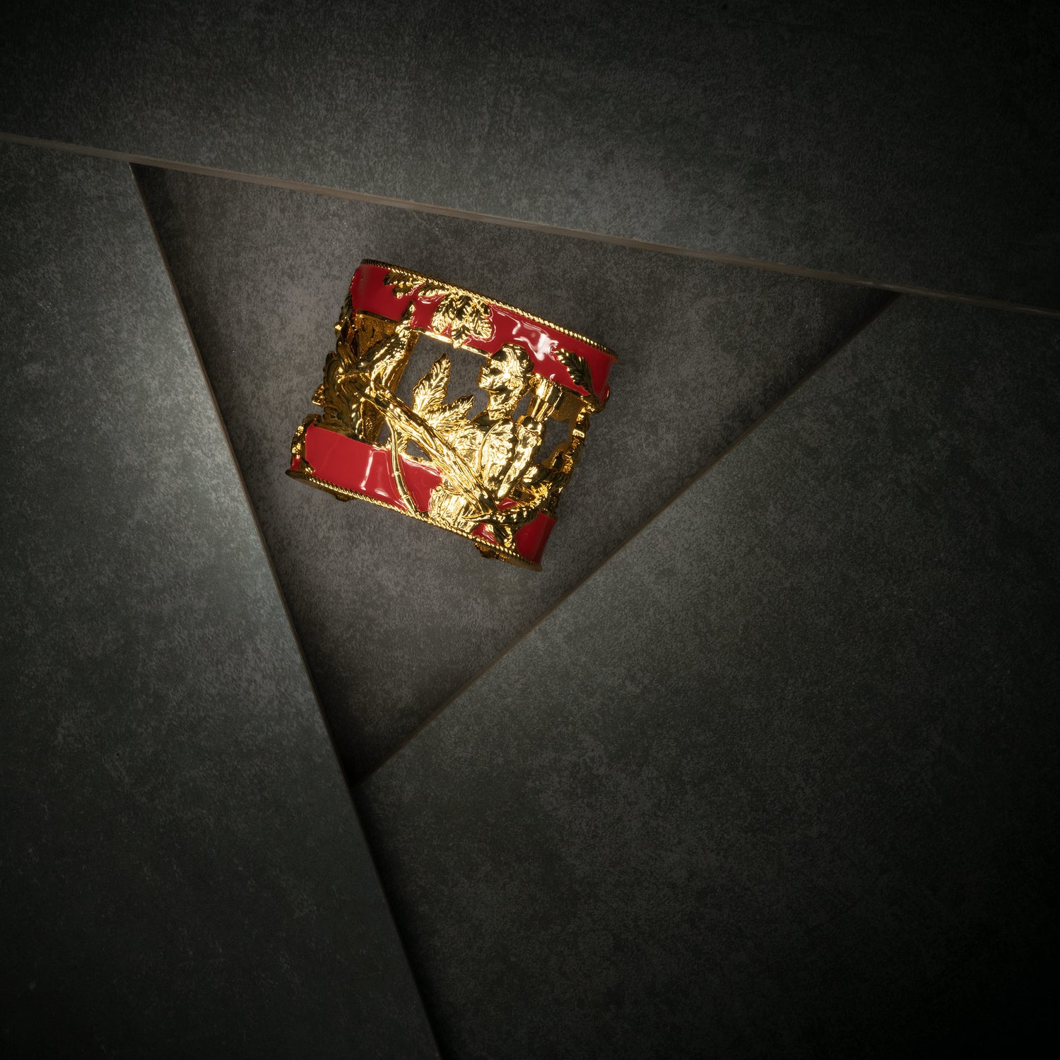 Crafted with 18K gold plate and adorned with a striking deep red enamel, the Vigor bracelet cuff serves as a reminder to remain steadfast in embracing your true self, while projecting an aura of respect and dignity.