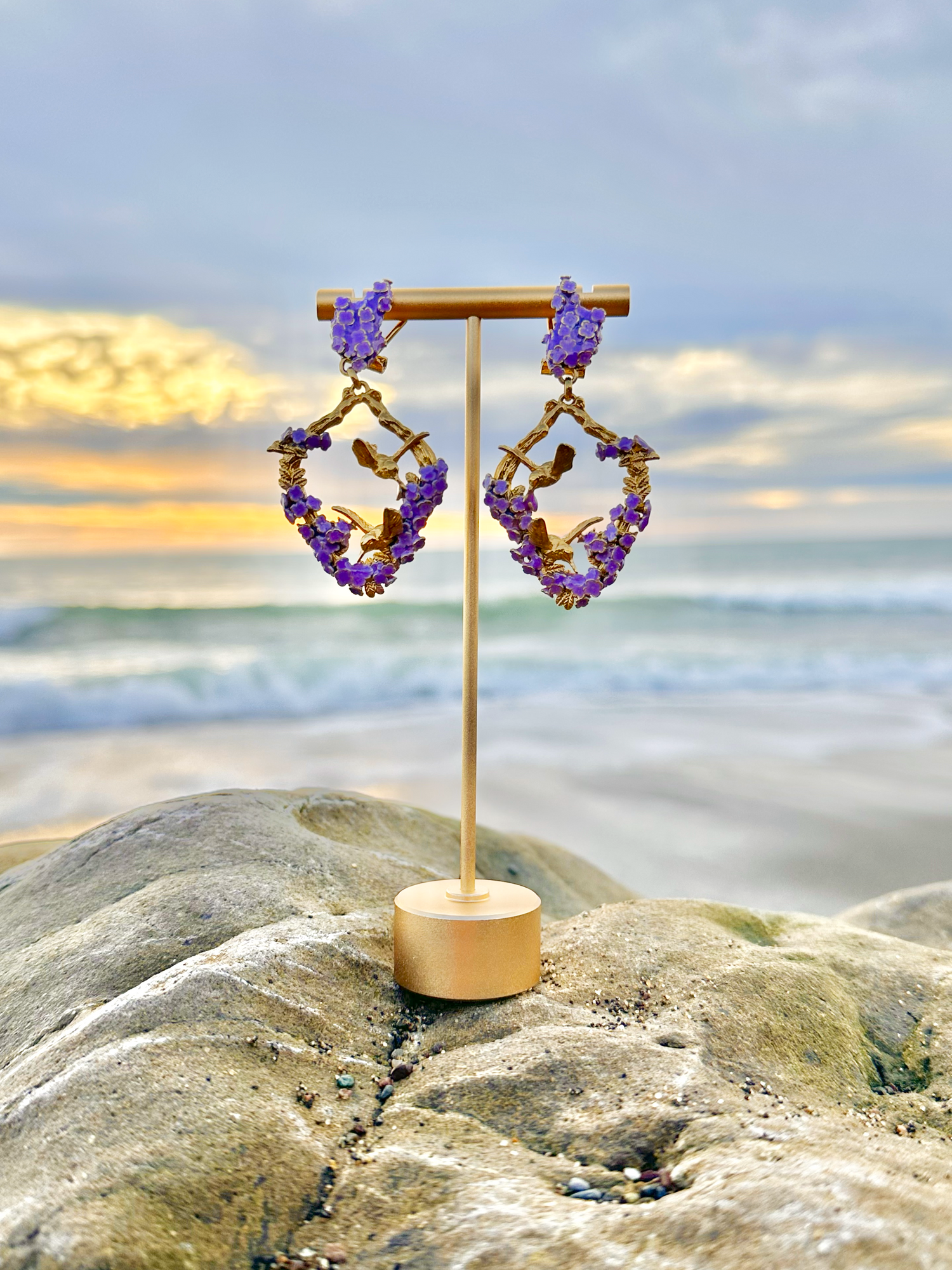 Inspired by Angela Mia's bronze sculpture Harmony, these exquisite earrings are crafted with 18K gold plating and adorned with an enchanting hand-painted lavender enamel finish.